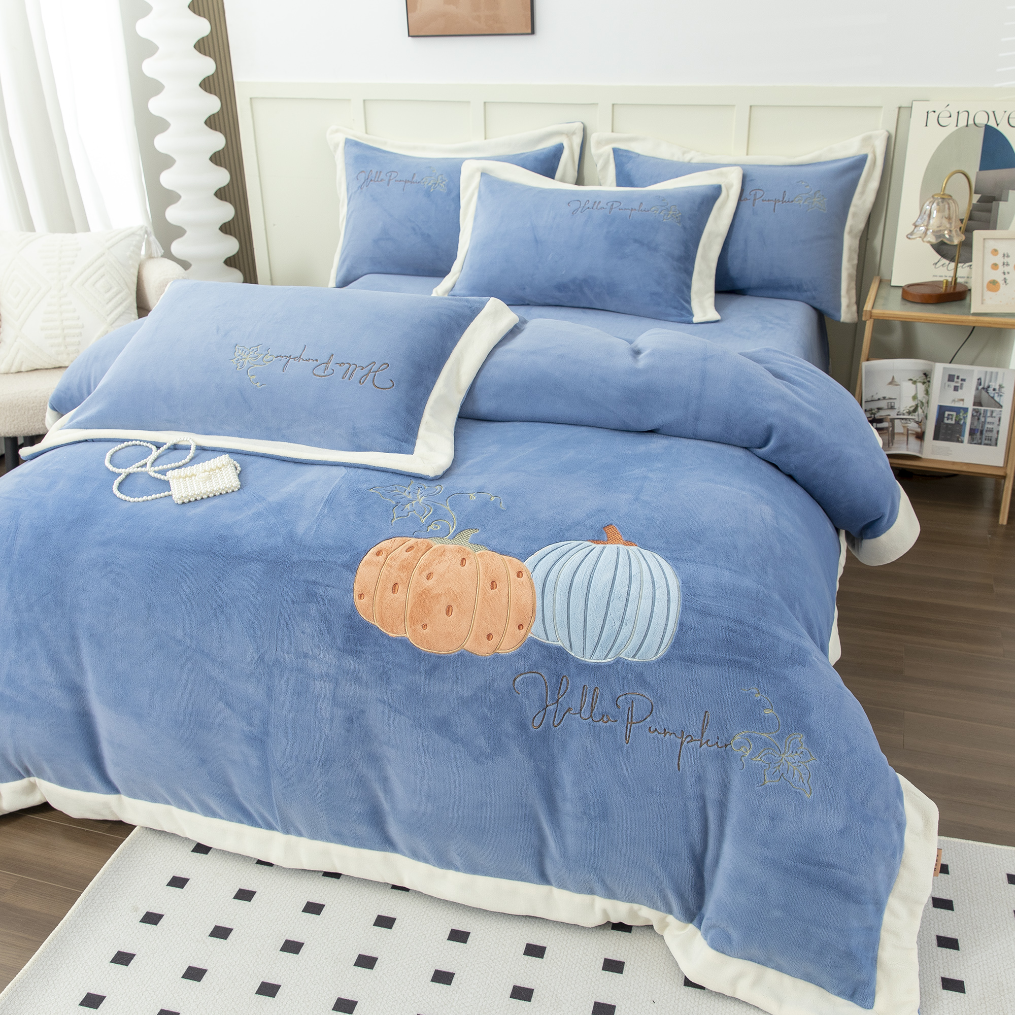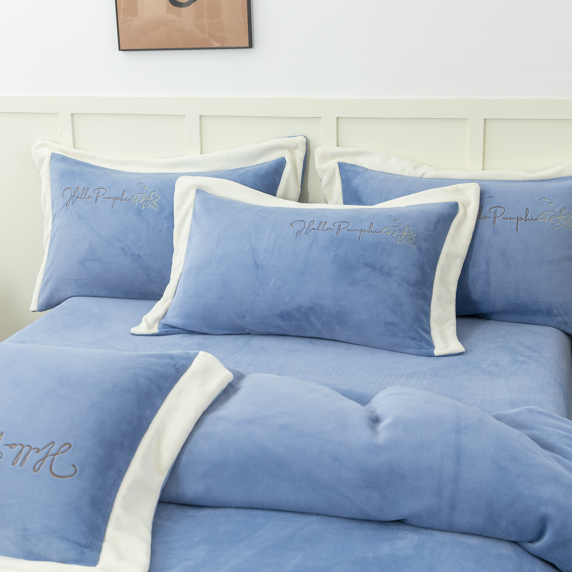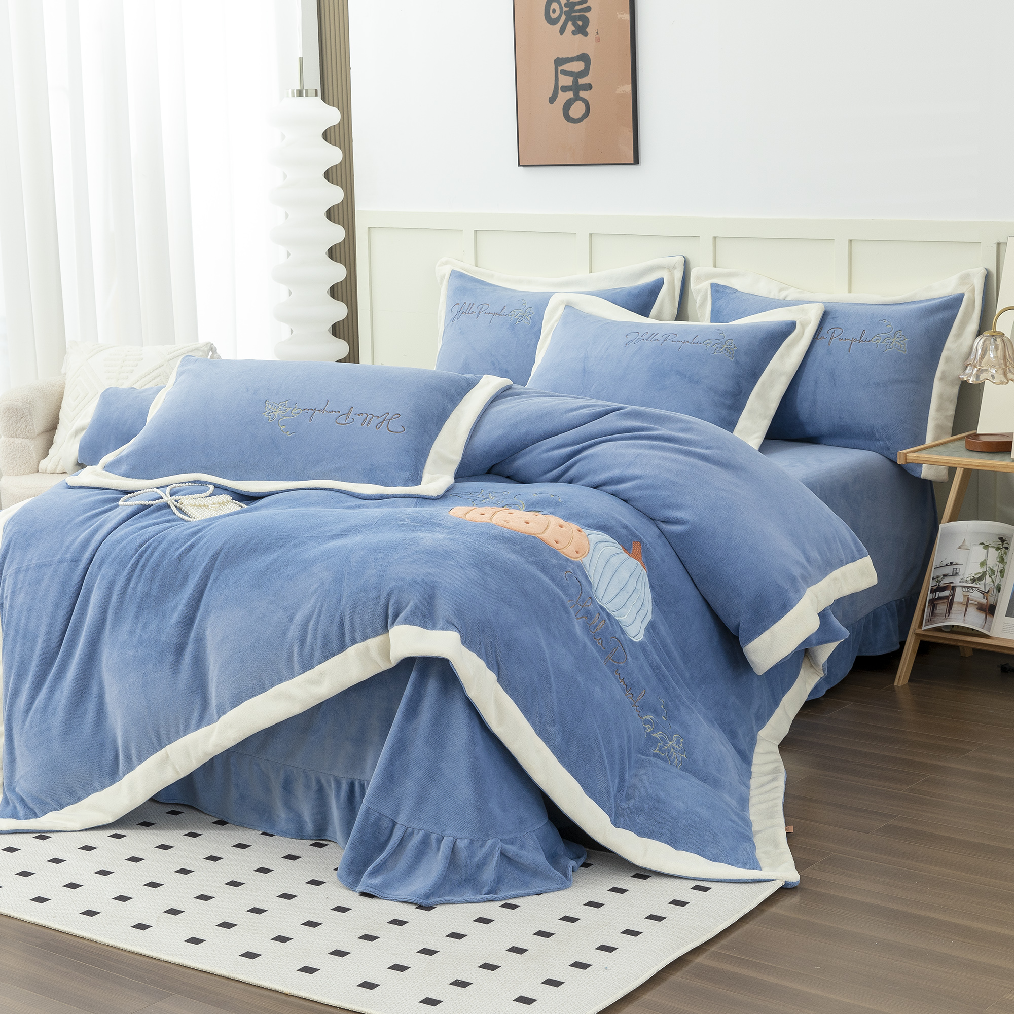 贝尔 2025新款纯色高克重牛奶绒刺绣四件套-羽魅 羽魅-蓝色,羽魅-蓝色