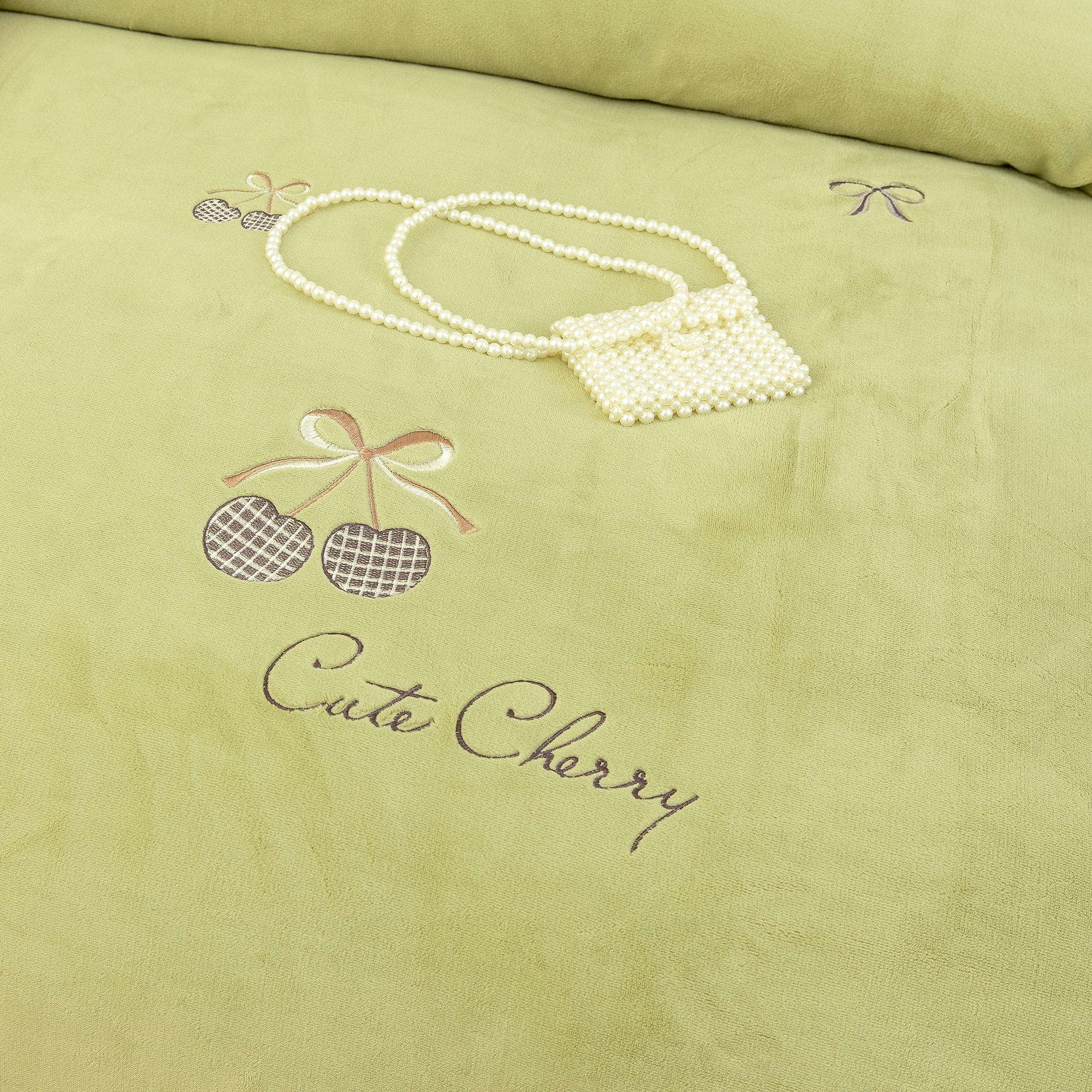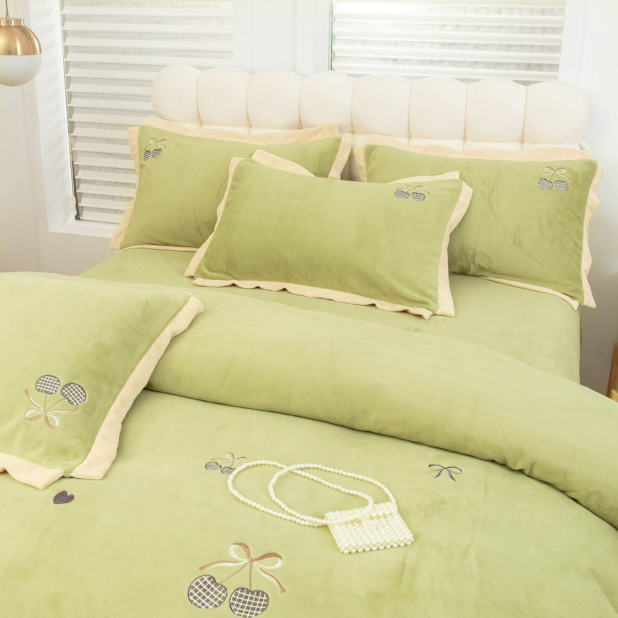 商品名称:贝尔 2025新款甜蜜樱桃-纯色高克重全消光蚕丝绒(赠送拎袋)-段角刺绣四件套 甜蜜樱桃-森林绿