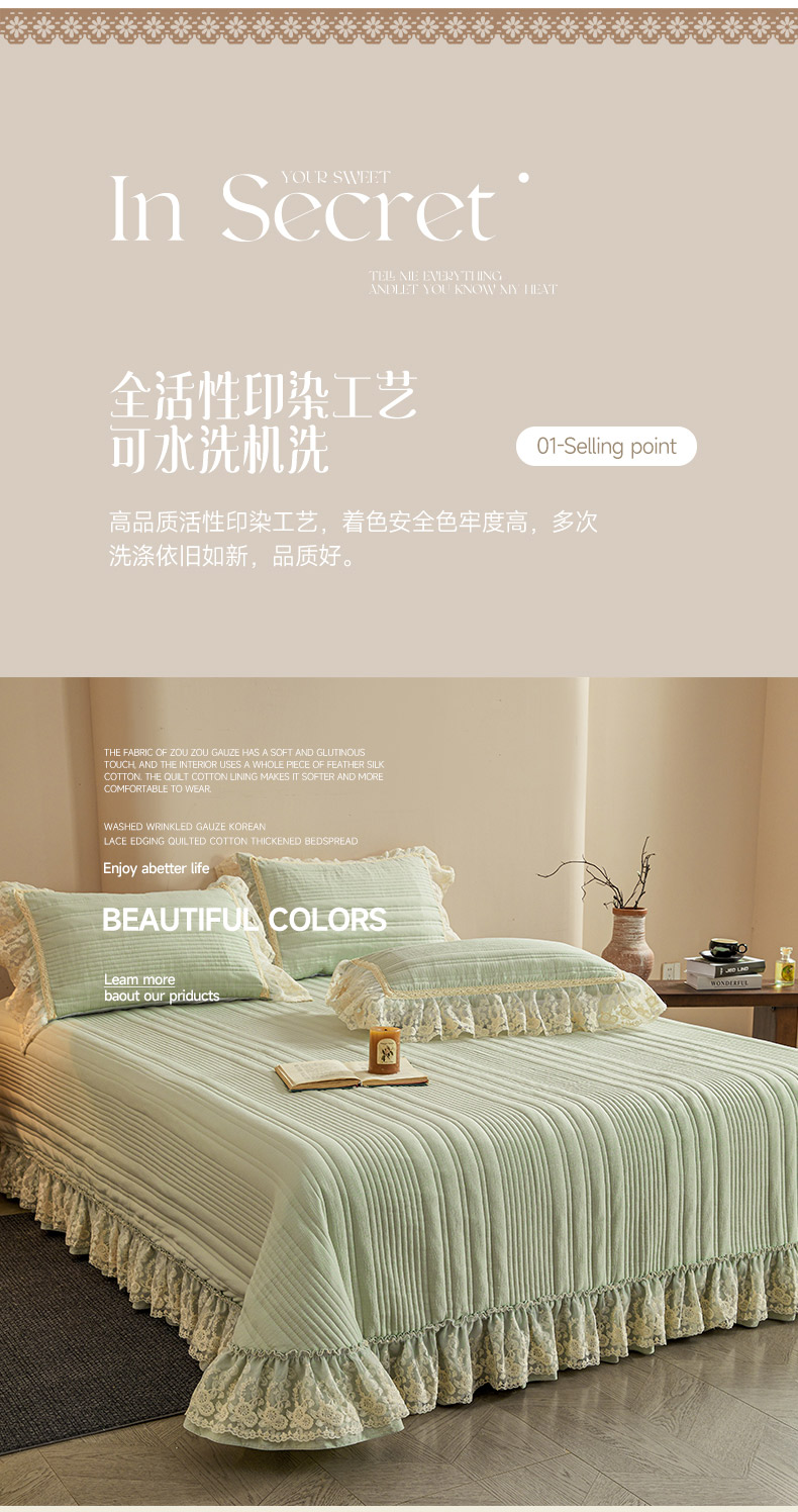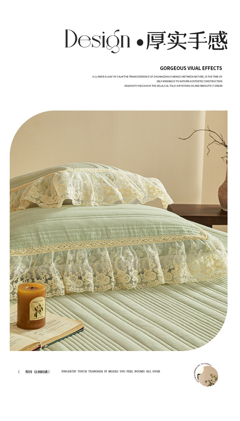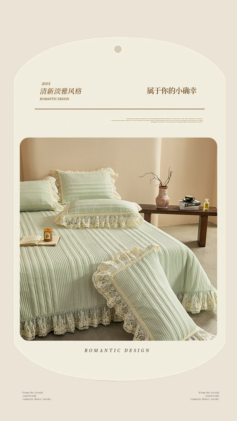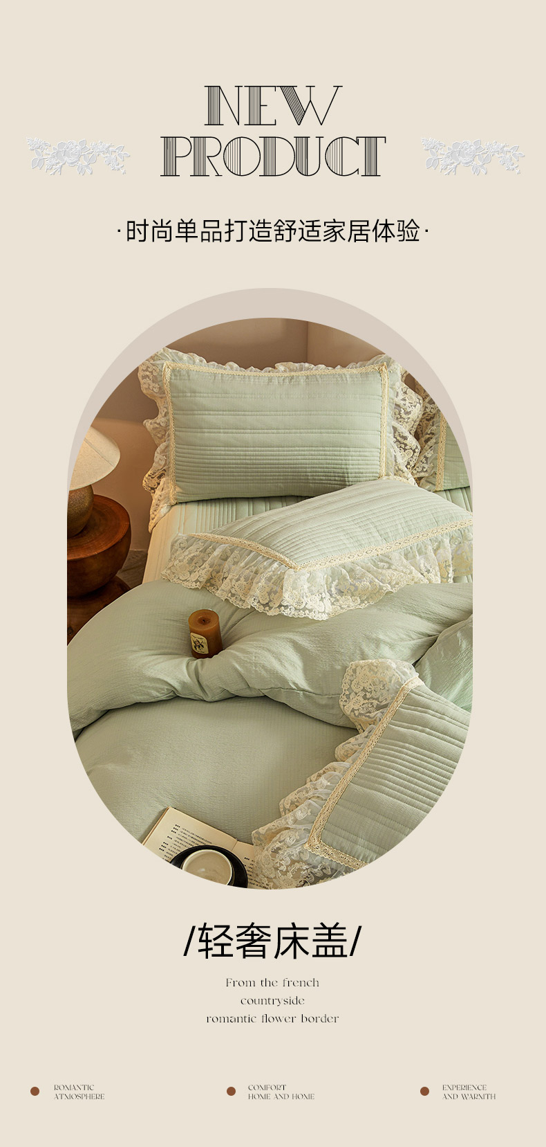 当前位置: 91家纺网 > 商品网购 > 床品套件 > 四件套 > 其它四件套 > 鼎丰家纺 2025新款法式浪漫花边皱皱纱床盖四件套 蔷薇-清洗绿