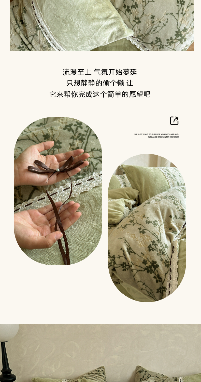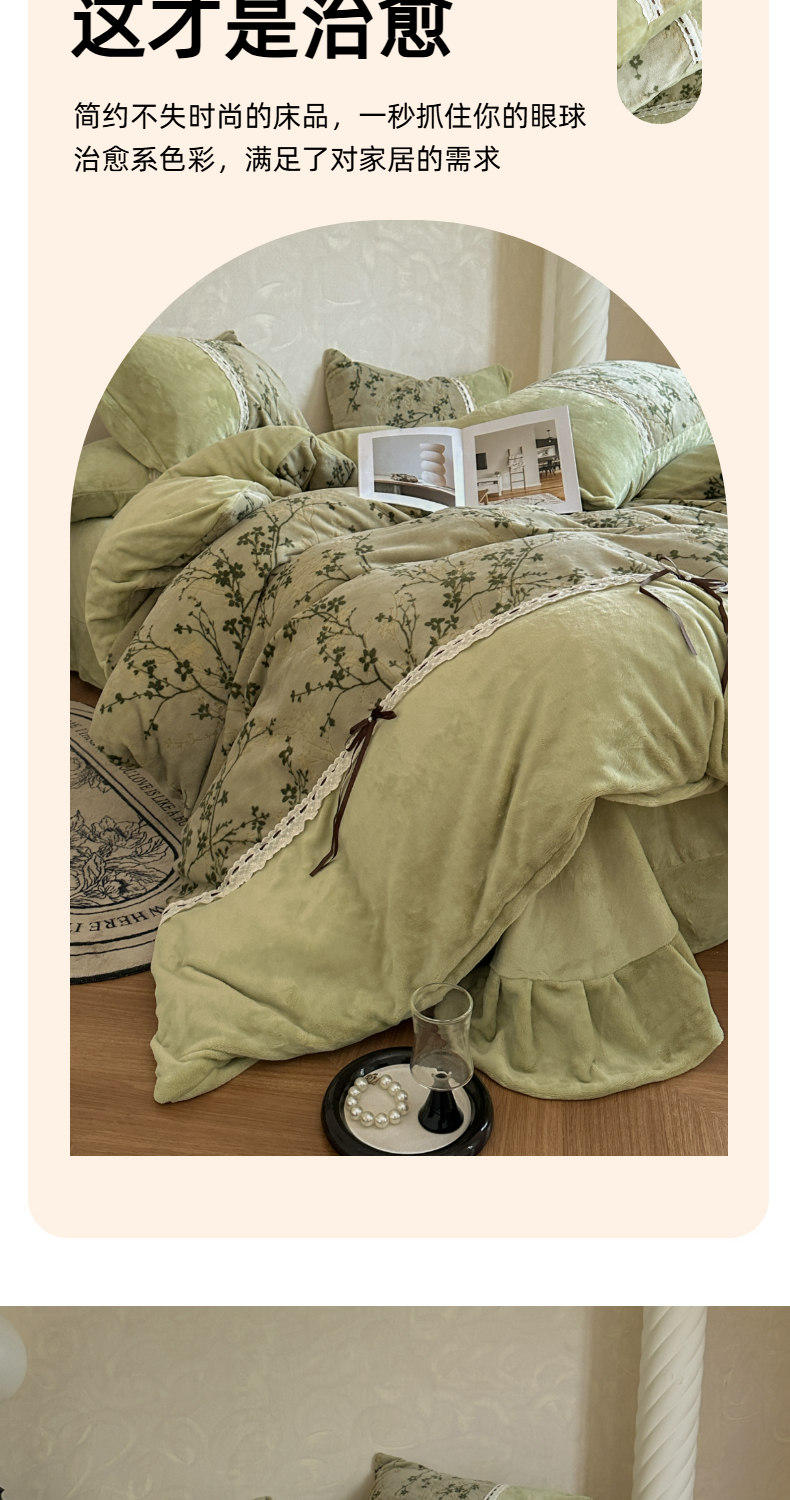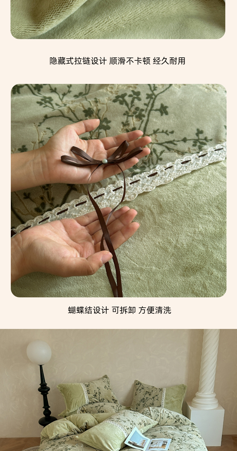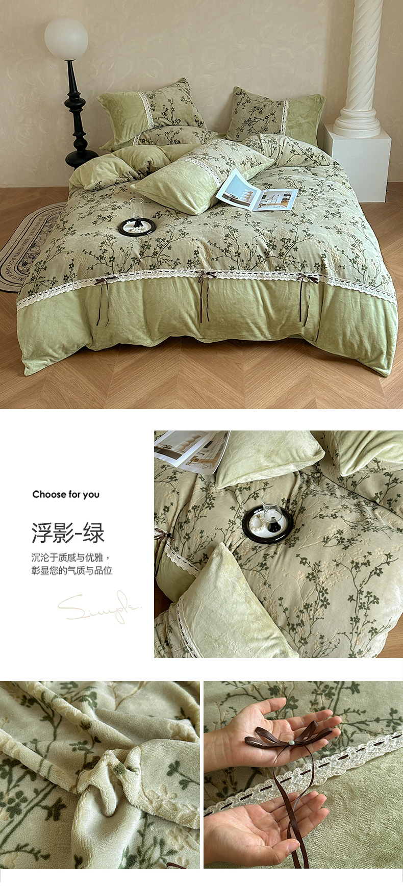 当前位置: 91家纺网 > 商品网购 > 床品套件 > 四件套 > 牛奶绒四件套 > 昊川家纺 2025新款牛奶绒雕花绒轻奢花边蝴蝶结拼接款四件套 浮影-绿
