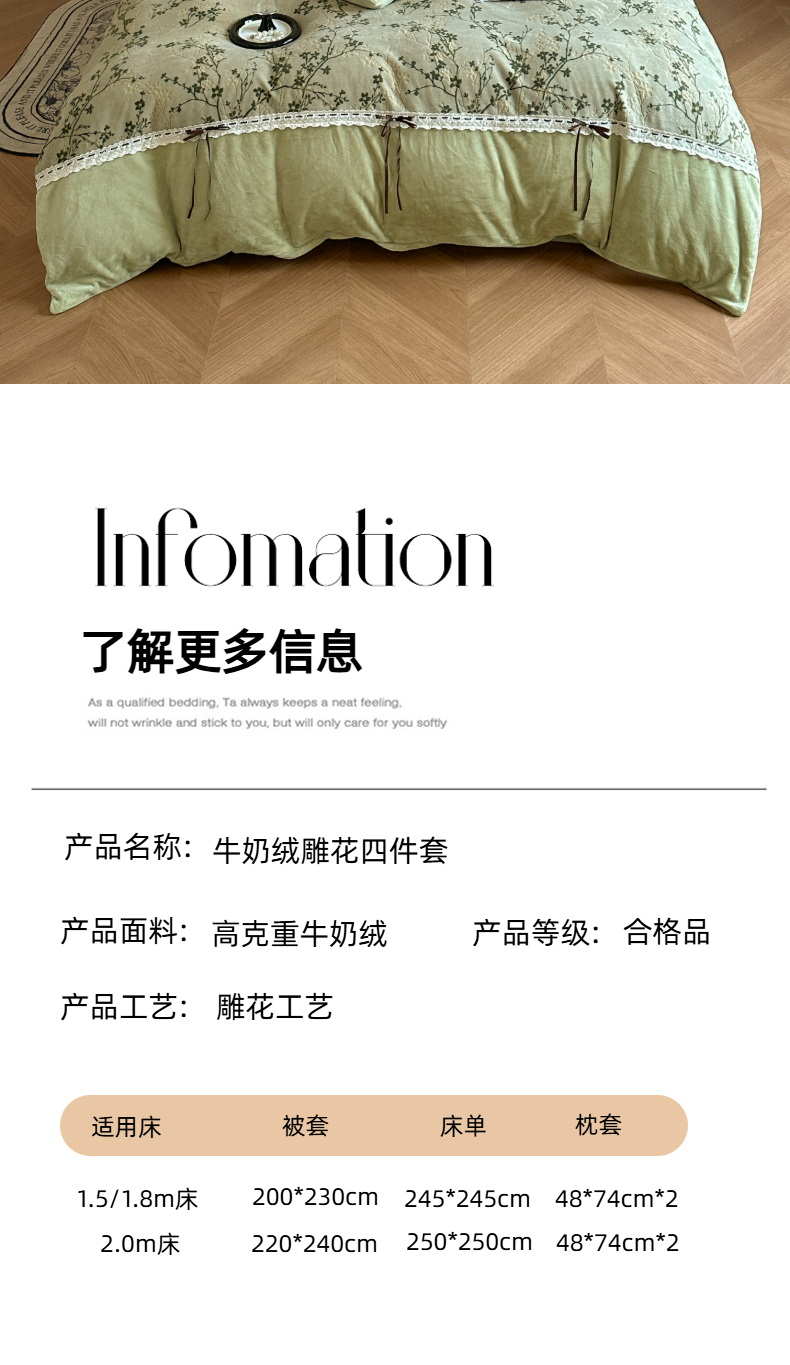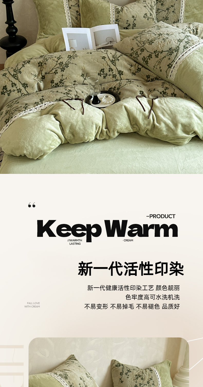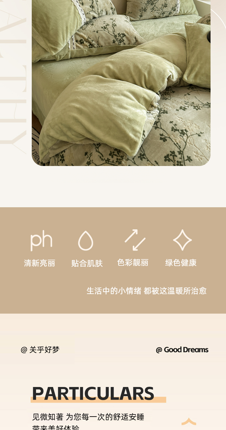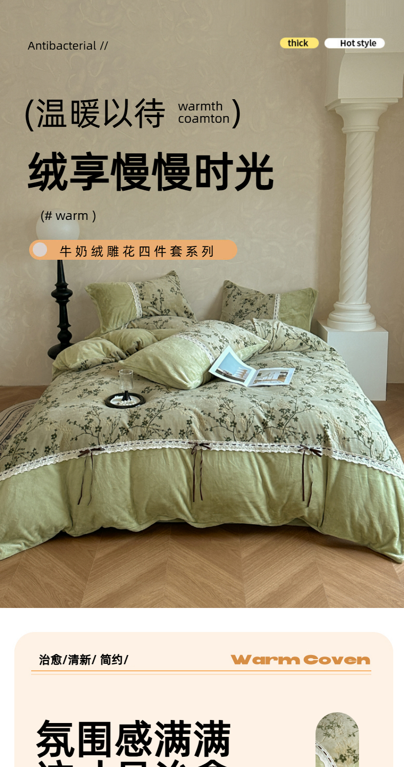 当前位置: 91家纺网 > 商品网购 > 床品套件 > 四件套 > 牛奶绒四件套 > 昊川家纺 2025新款牛奶绒雕花绒轻奢花边蝴蝶结拼接款四件套 浮影-绿