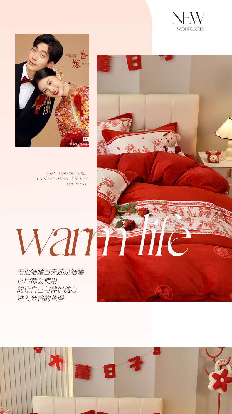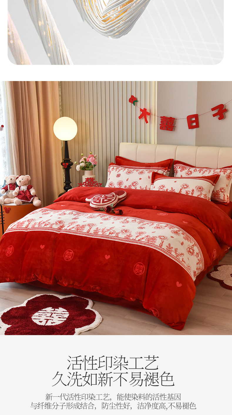 商品名称:曲之慕 2025新款高克重牛奶绒简约婚庆四件套 囍多多