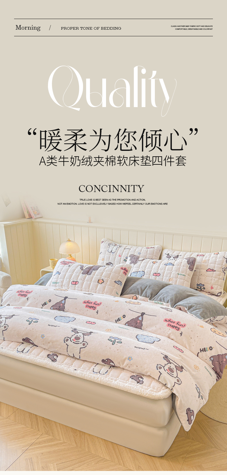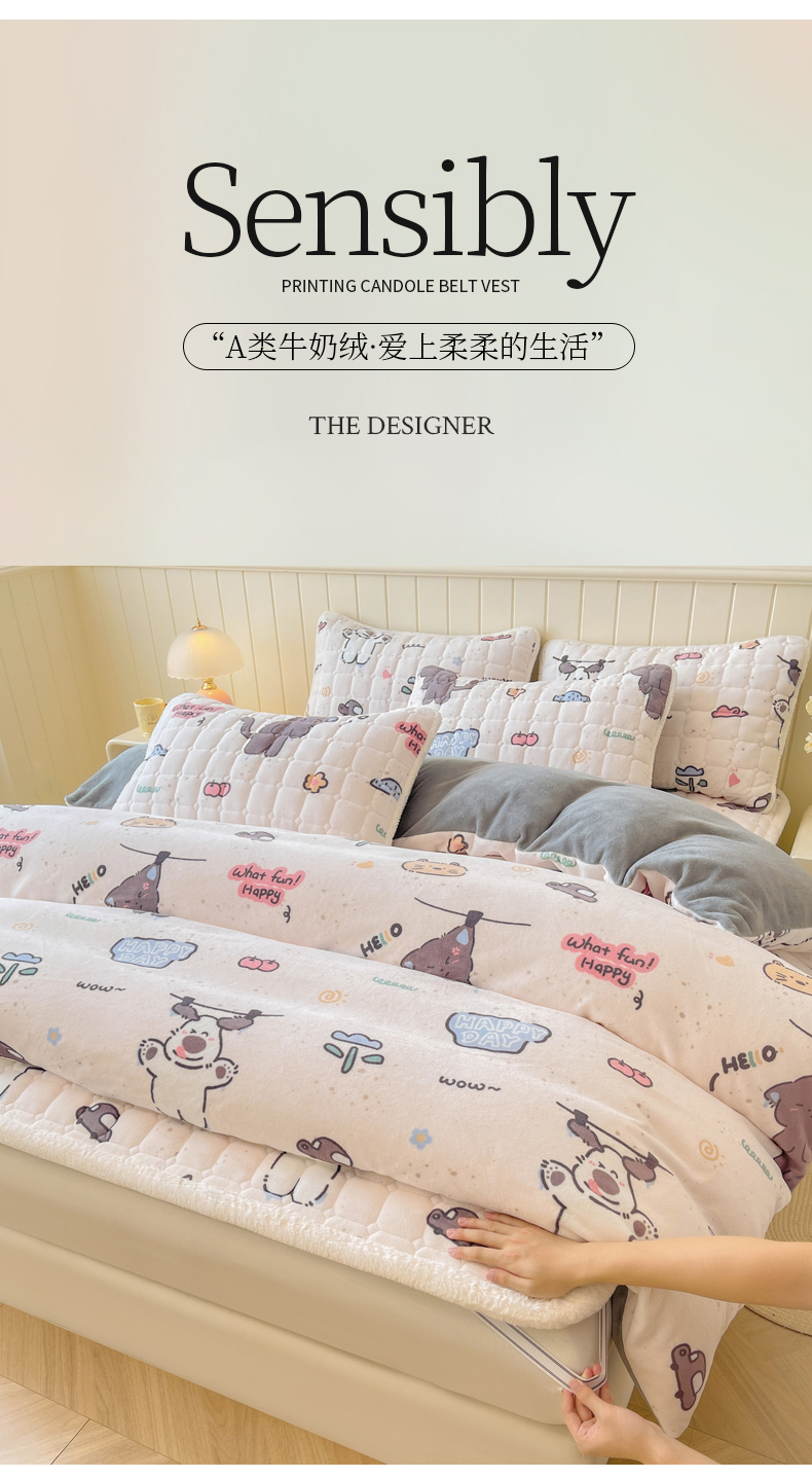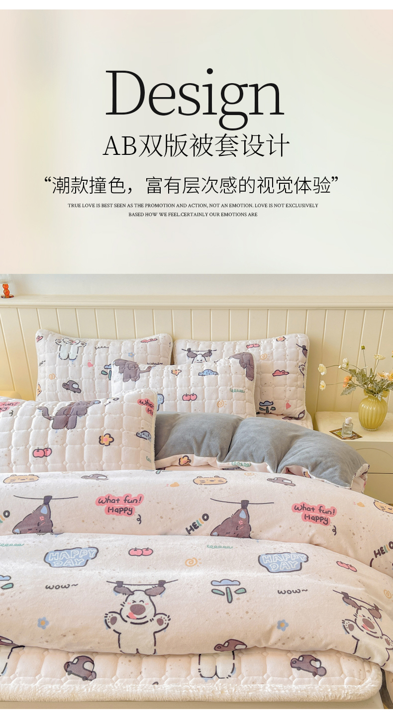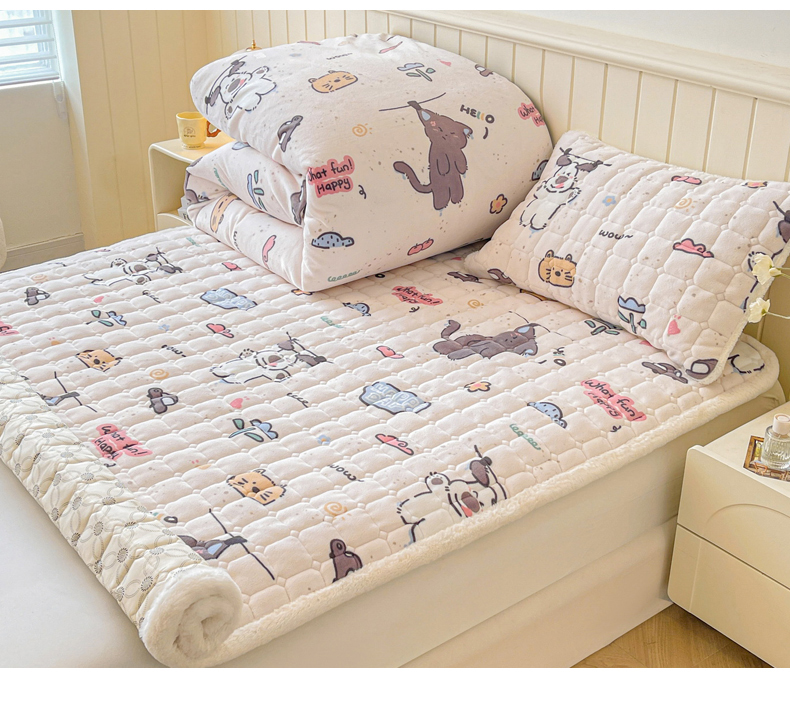 商品名称:LIFE.丽芙 2025秋冬新款A类牛奶绒加厚夹棉床褥垫+被套组合四件套 萌喵酷狗
