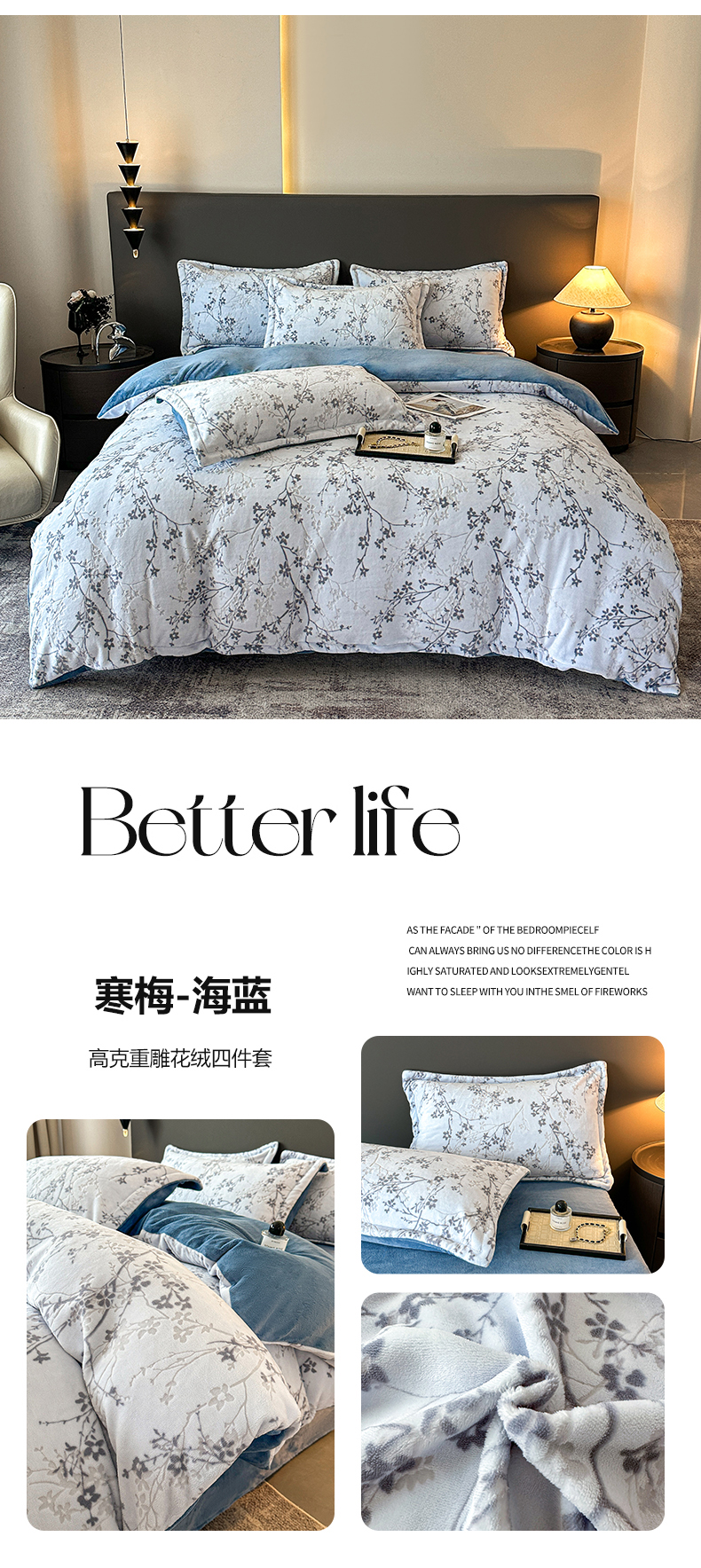 (总)大米家居 2025新款高克重简约雕花绒四件套寒梅系列,寒梅-果绿,寒梅-海蓝,寒梅-卡其,寒梅-玫粉