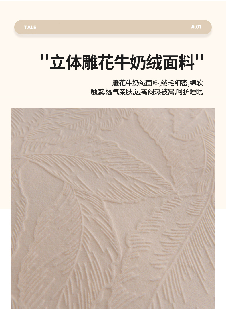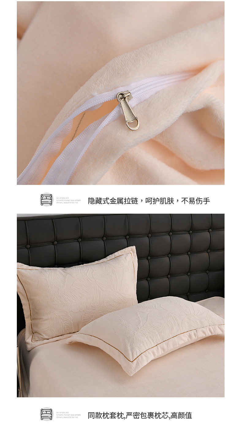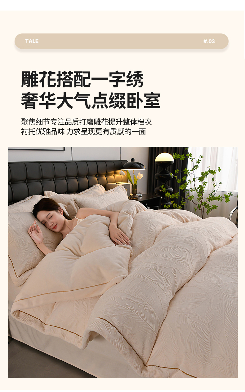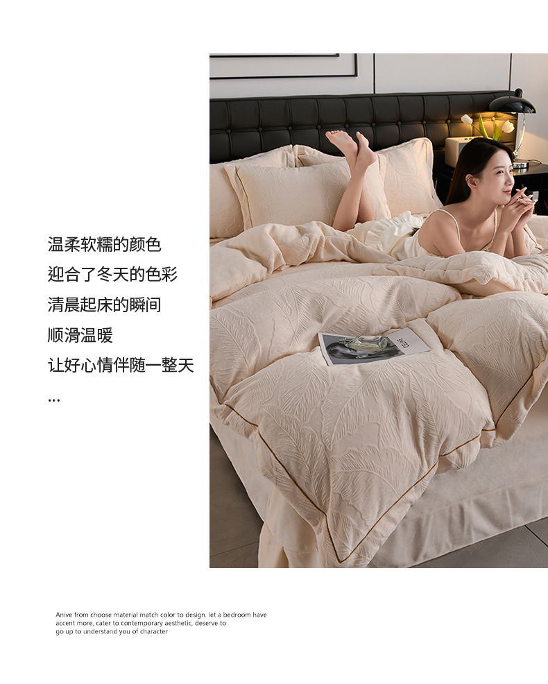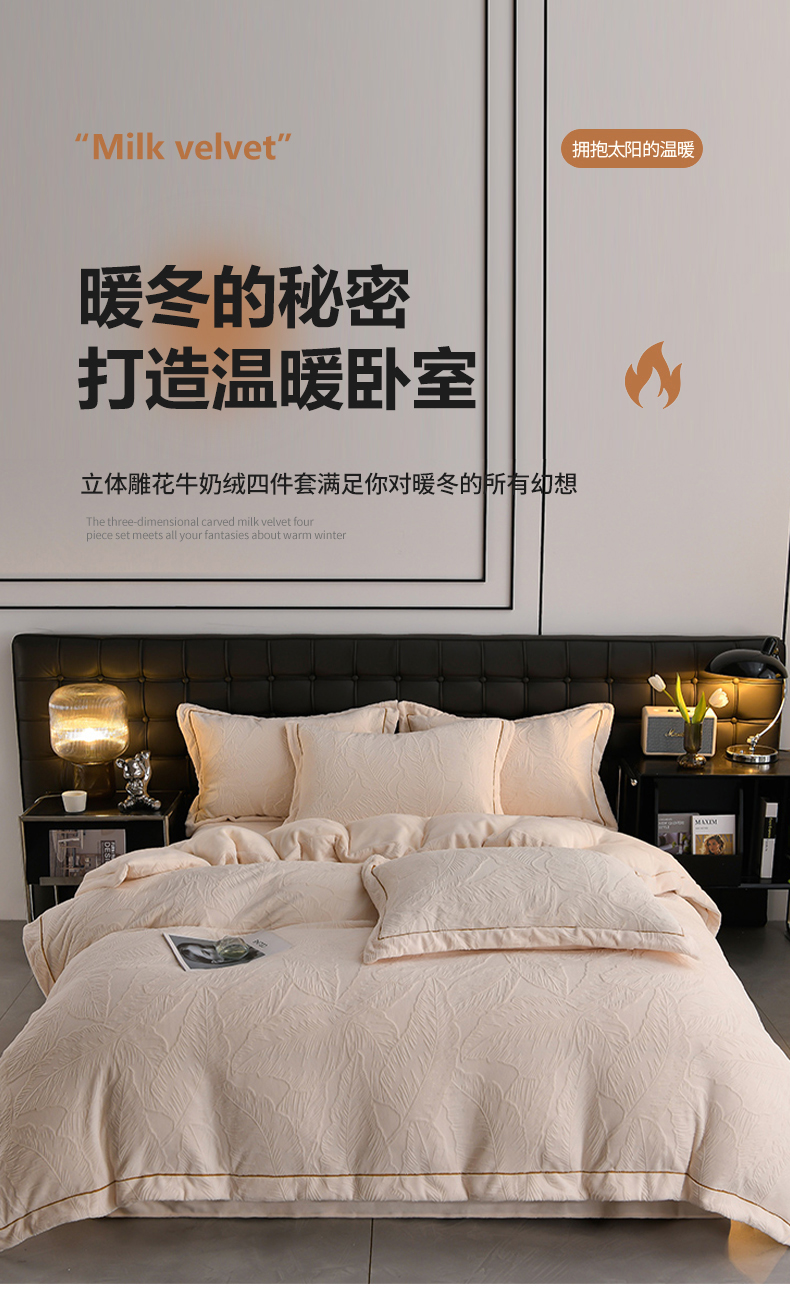 苏迪网销供货 2025新款牛奶绒四件套A类高克重全消光雕花一字绣工艺款 芭蕉叶-米白
