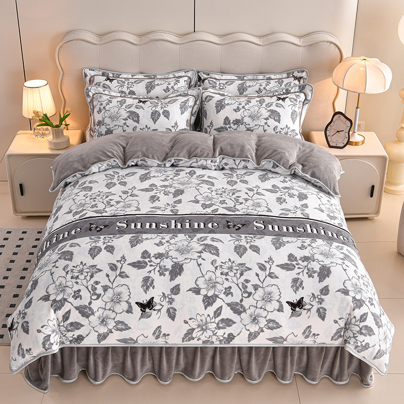 当前位置: 91家纺网 > 商品网购 > 床品套件 > 四件套 > 牛奶绒四件套 > 德比尔斯 2025新款牛奶绒床裙四件套8-9斤法莱绒直播爆款日产2万套 蝶语灰