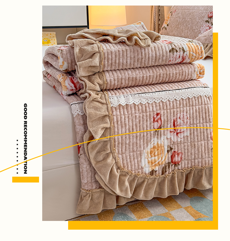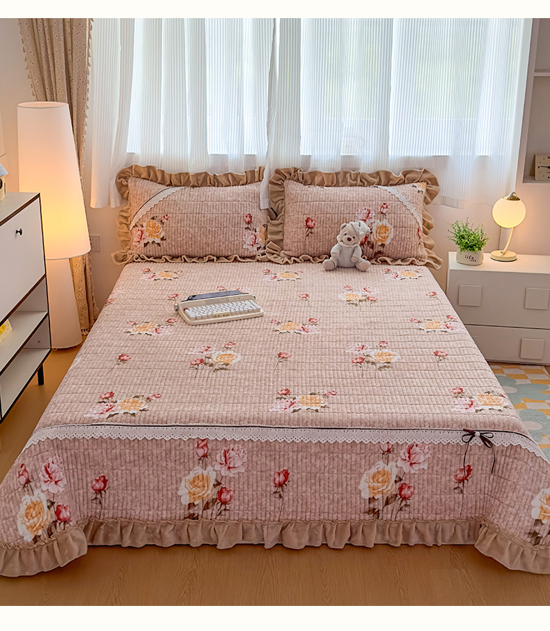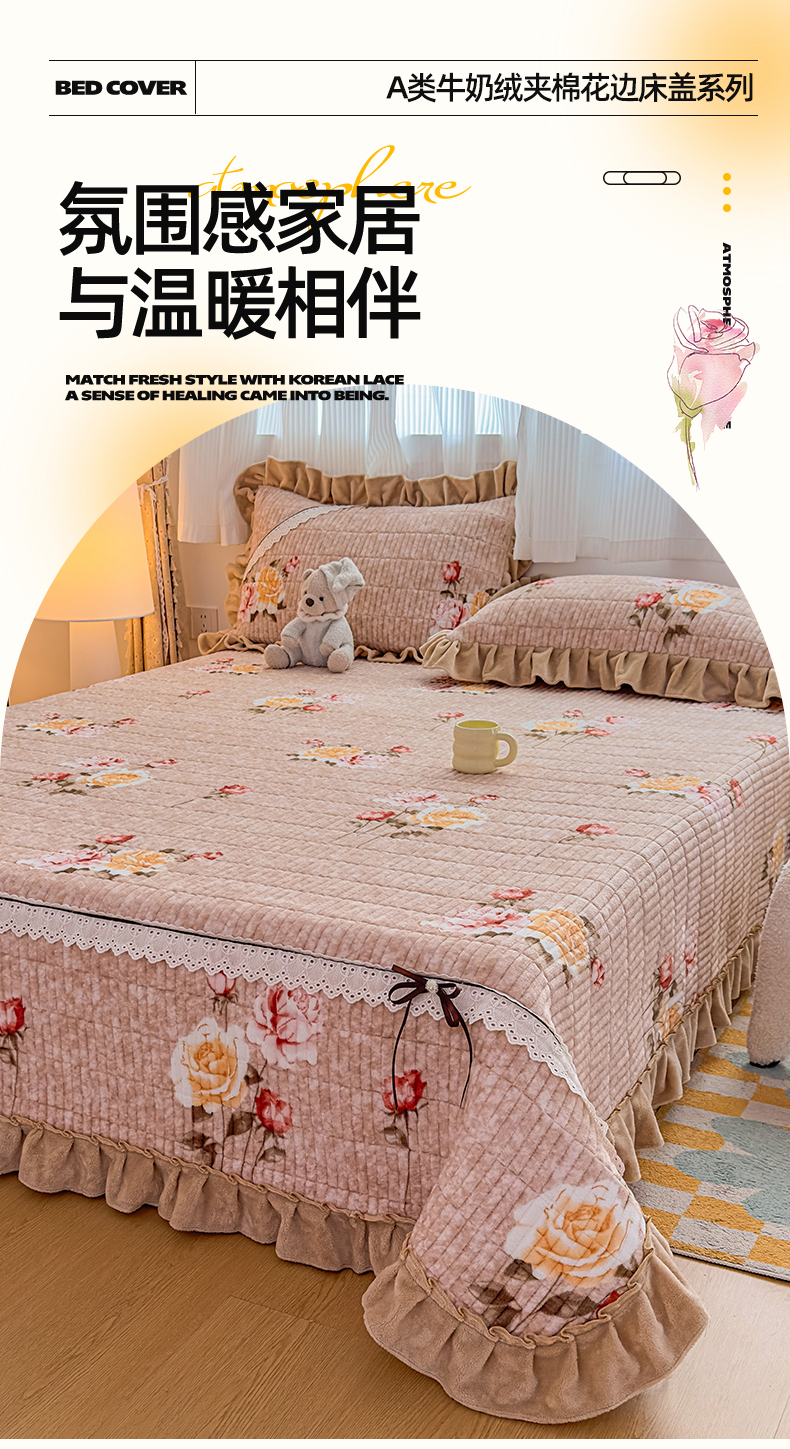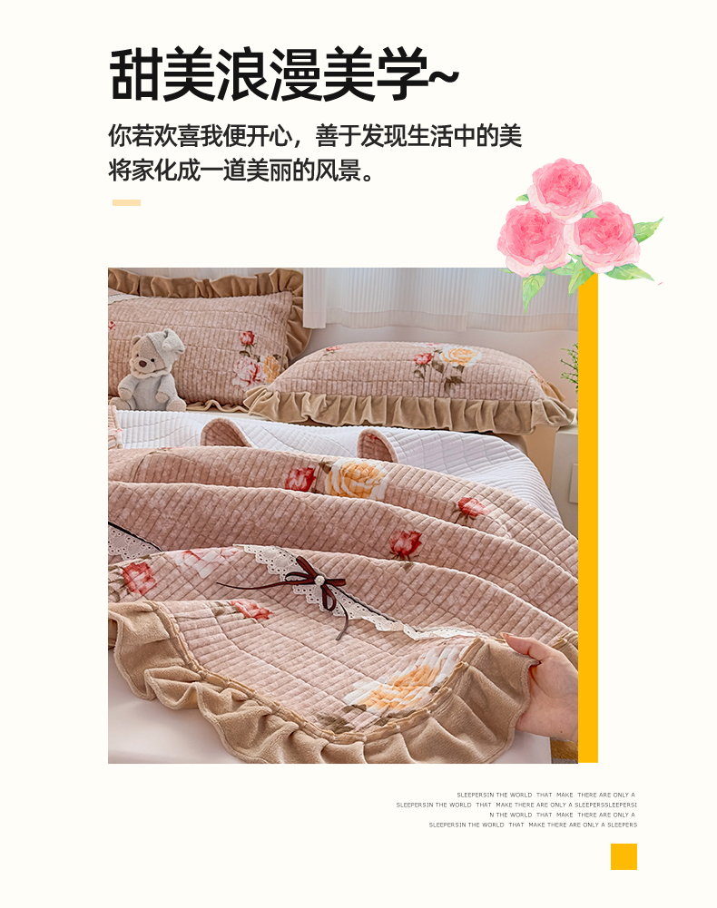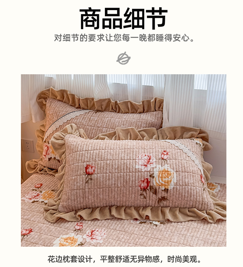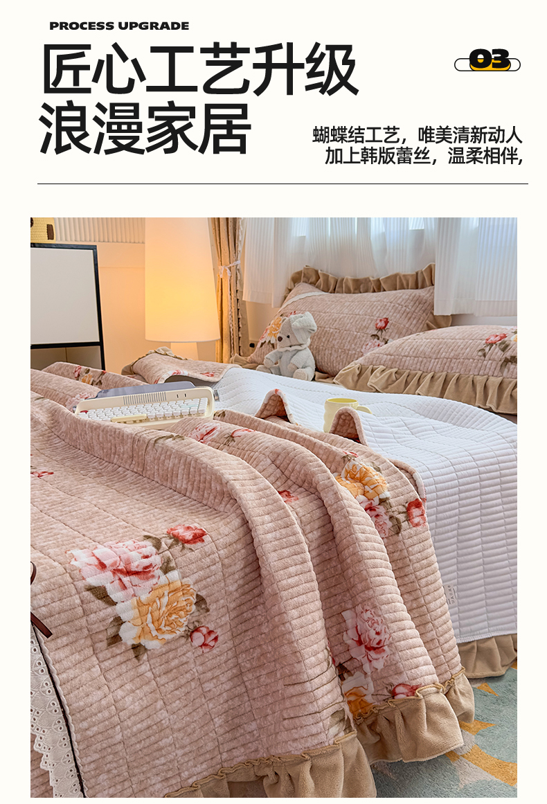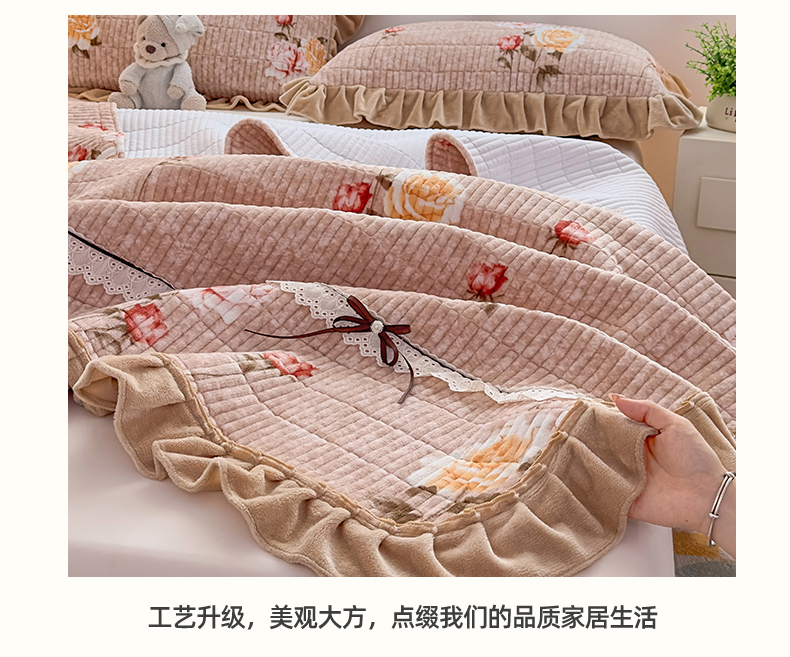 当前位置: 91家纺网 > 商品网购 > 床品套件 > 三件套 > 恒爱家纺 2025新款牛奶绒夹棉花边床盖系列三件套 争奇斗艳-驼