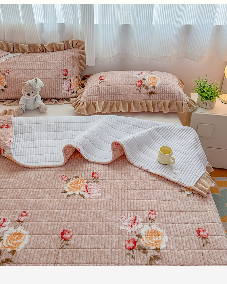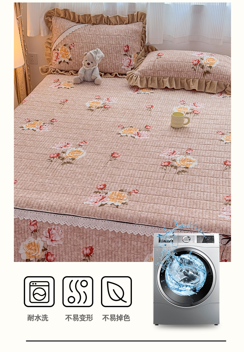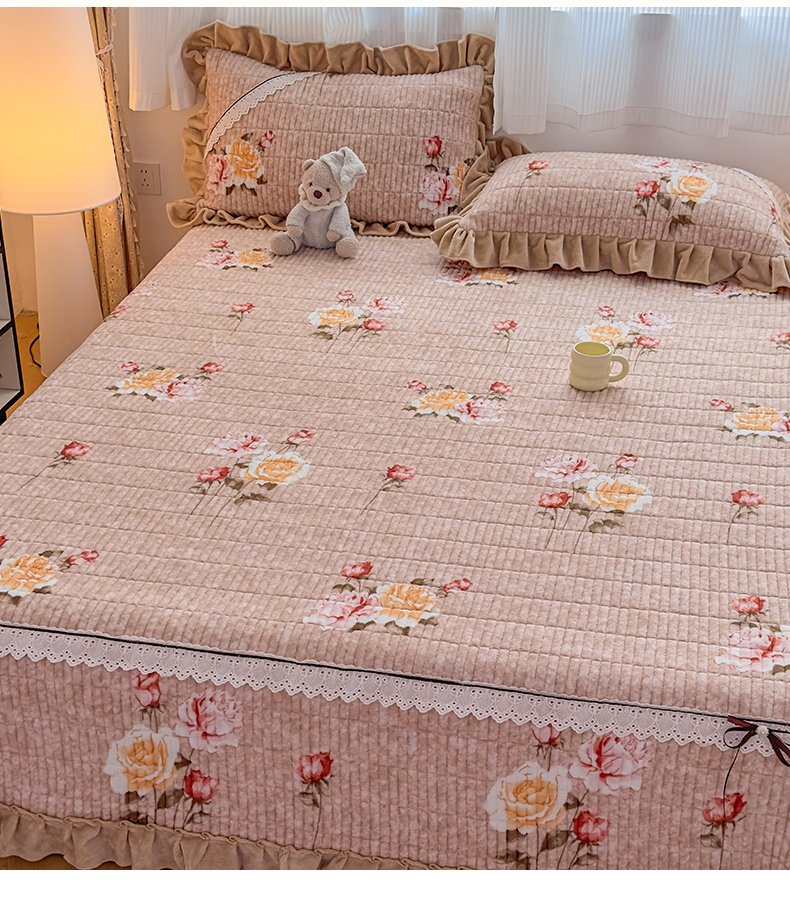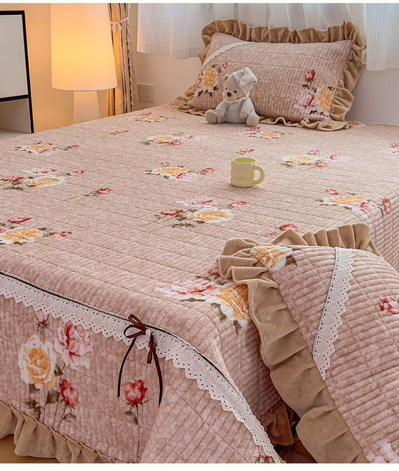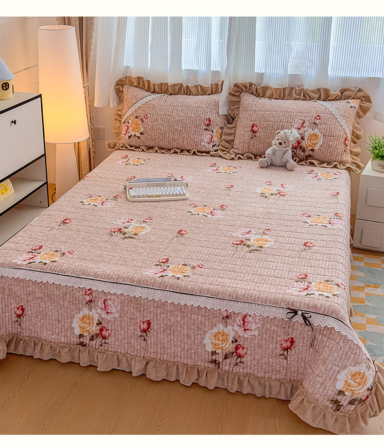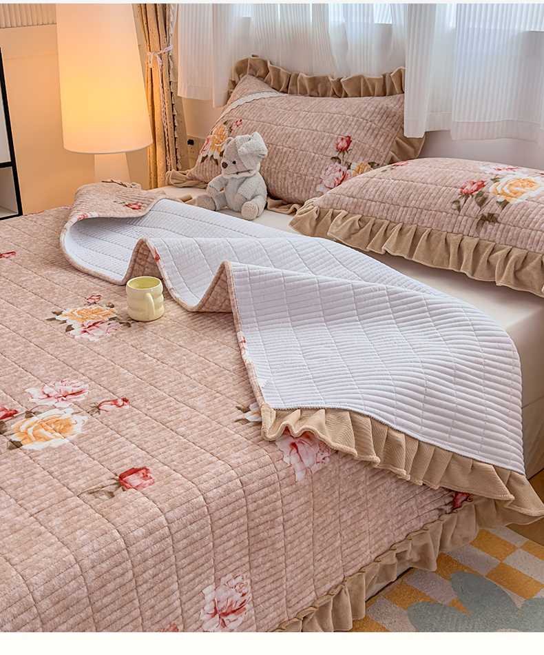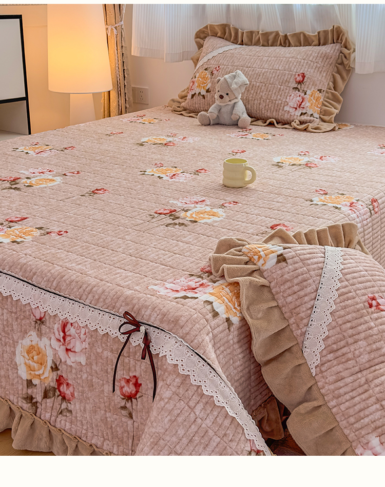 当前位置: 91家纺网 > 商品网购 > 床品套件 > 三件套 > 恒爱家纺 2025新款牛奶绒夹棉花边床盖系列三件套 争奇斗艳-驼