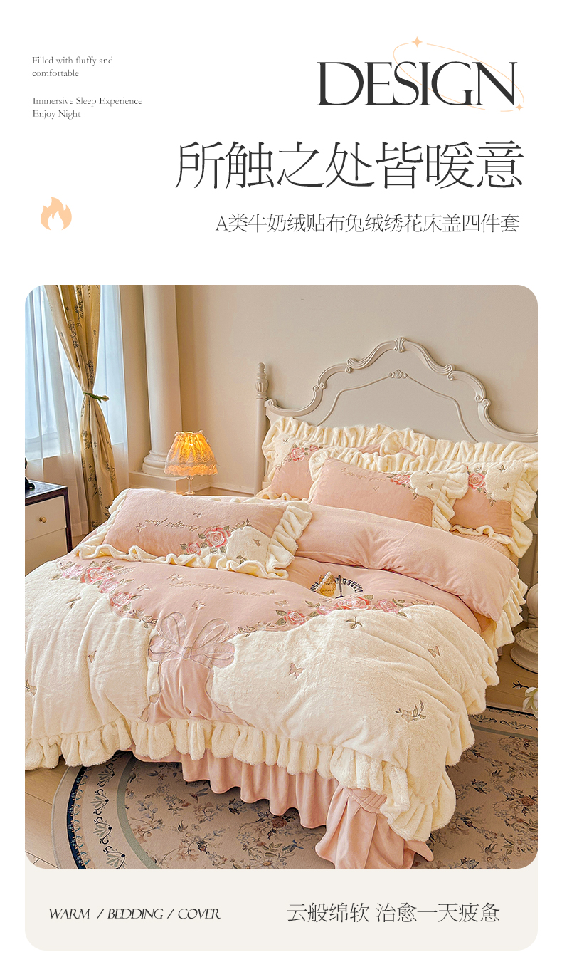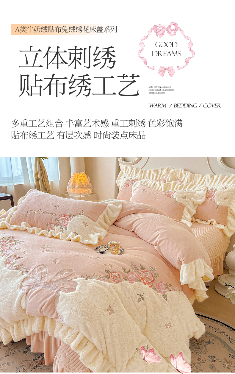 商品名称:宜凡家纺 2025新款牛奶绒贴布兔绒绣花床盖四件套--淡香伊人系列 淡香伊人-奶油咖