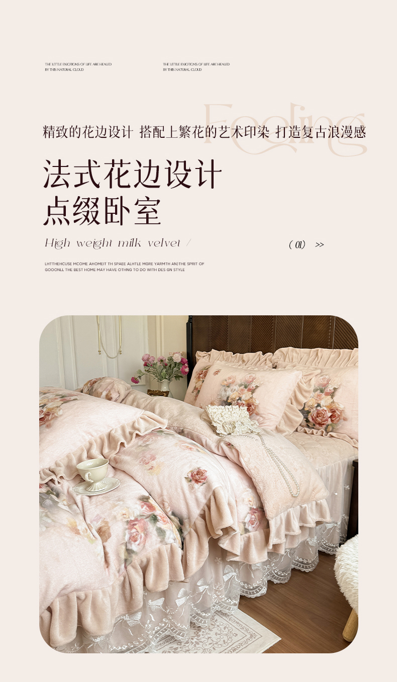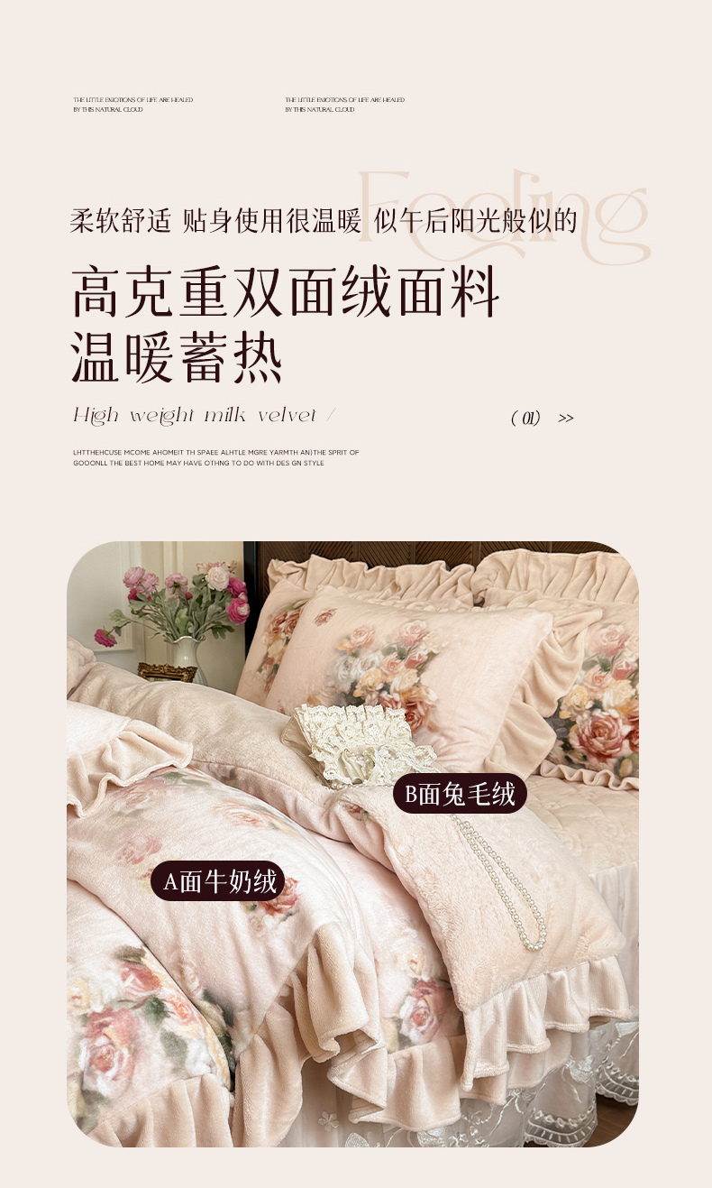 商品名称:宜凡家纺 2025新款牛奶绒5D数码印花夹棉床裙四件套 花开浪漫 粉玉
