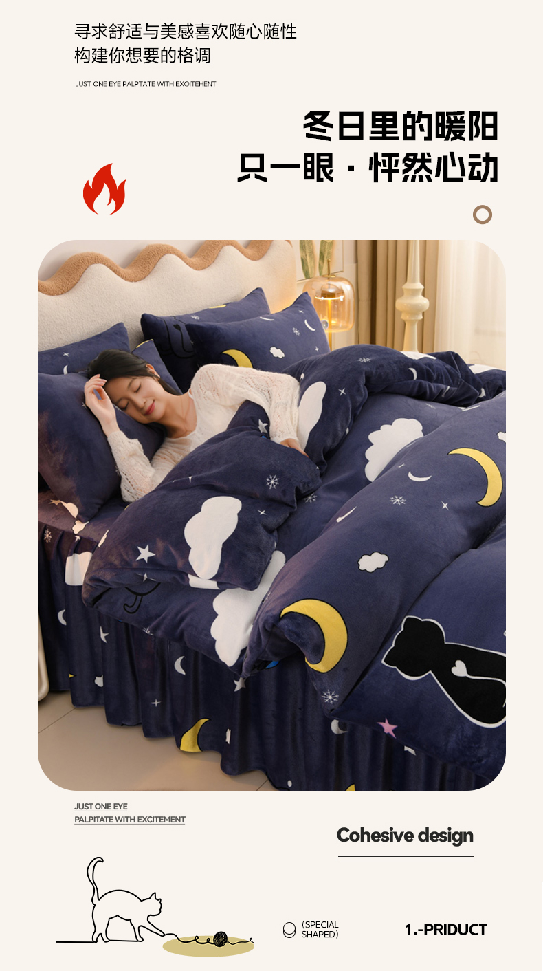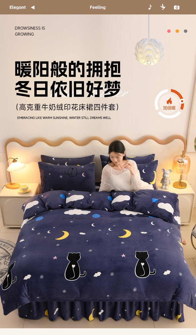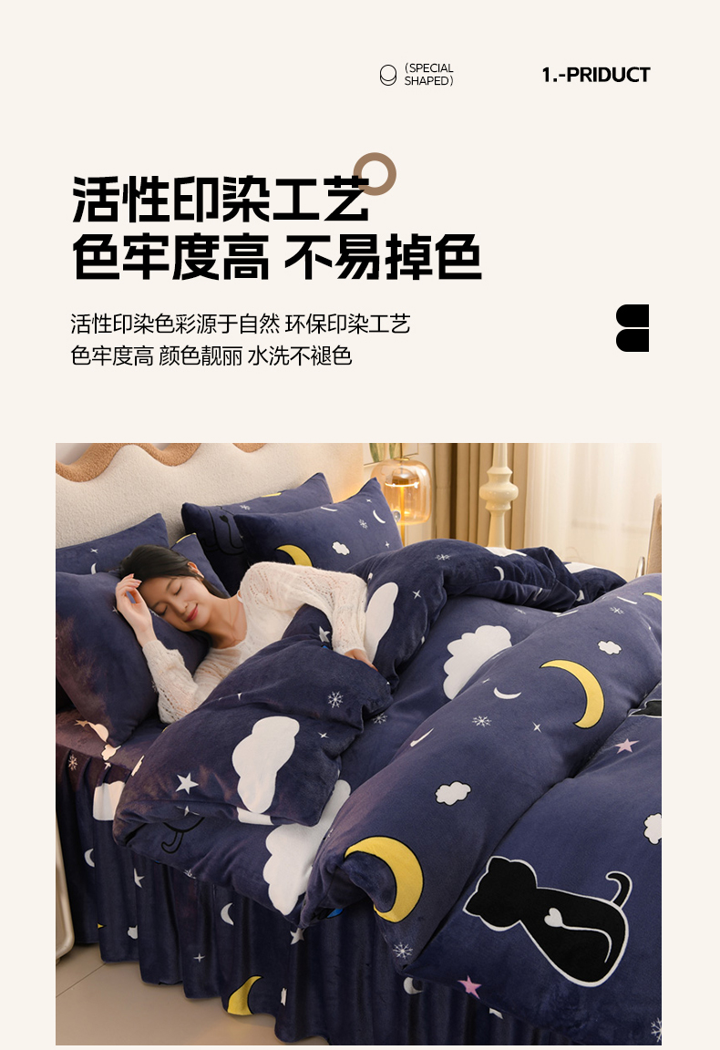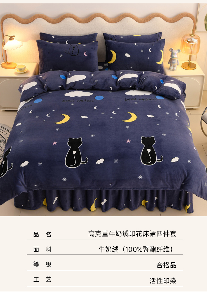 商品名称:圣靓 2025新款高克重牛奶绒四件套印花床裙款 晚安喵喵