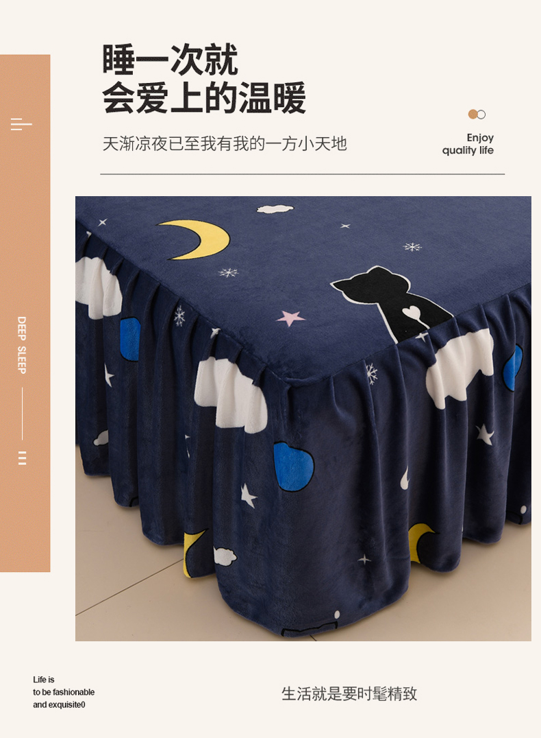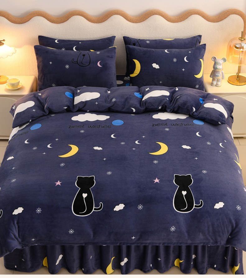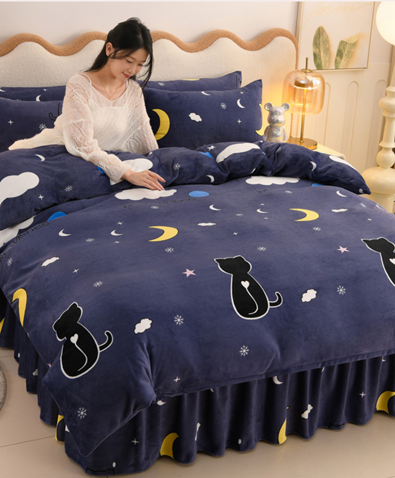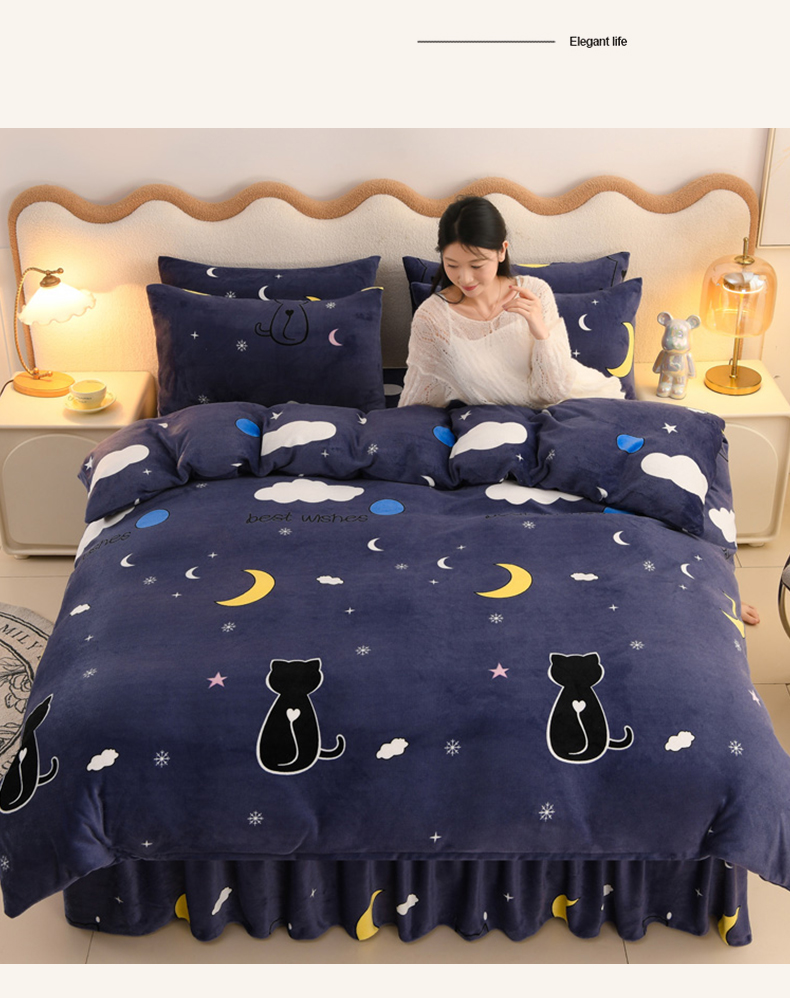 圣靓 2025新款高克重牛奶绒四件套印花床裙款 晚安喵喵