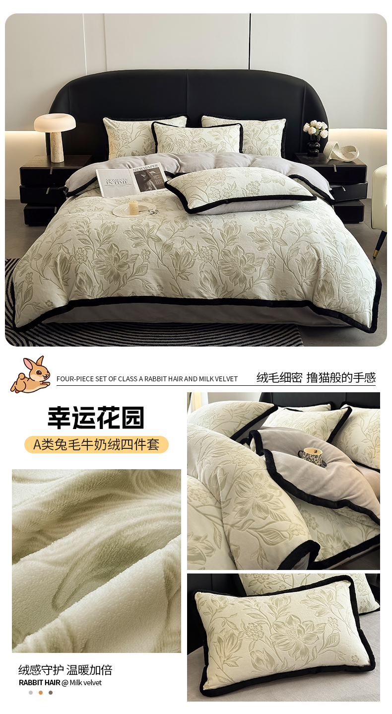 商品名称:卡罗兰 2025新款雕花牛奶绒兔毛包边四件套 幸运花园
