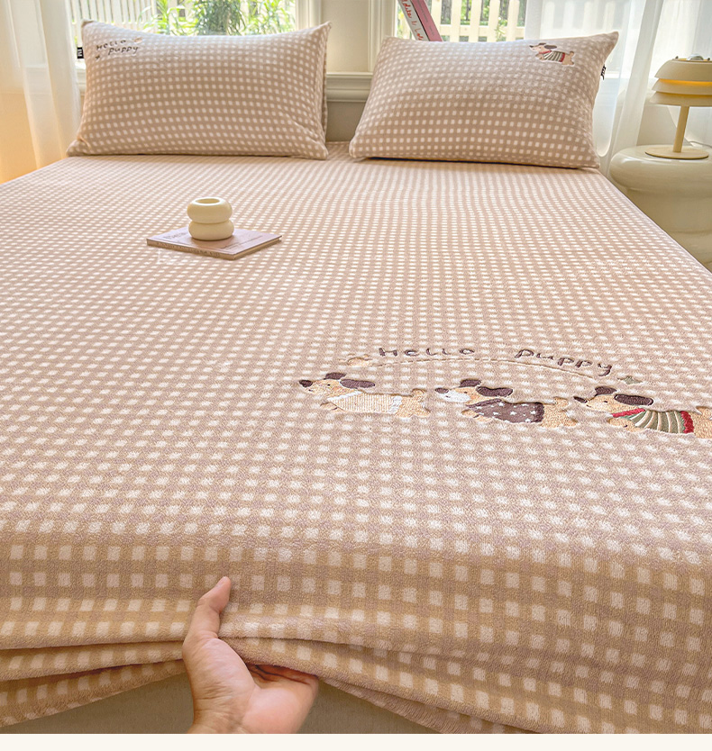 (总)乐美家纺 2025新款A类高克重贴布绣牛奶绒床笠三件套,快乐小狗,可爱狮,桃可爱,太阳狮,萌萌星,面包熊,蘑菇熊,南瓜小猪,星星兔,早安小狮子
