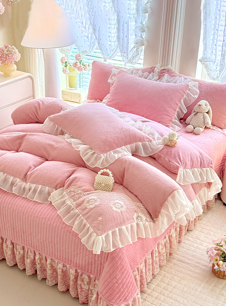 唐人居 2025新款高克重兔毛绒花边夹棉床盖四件套-满满爱 满满爱-奶白
