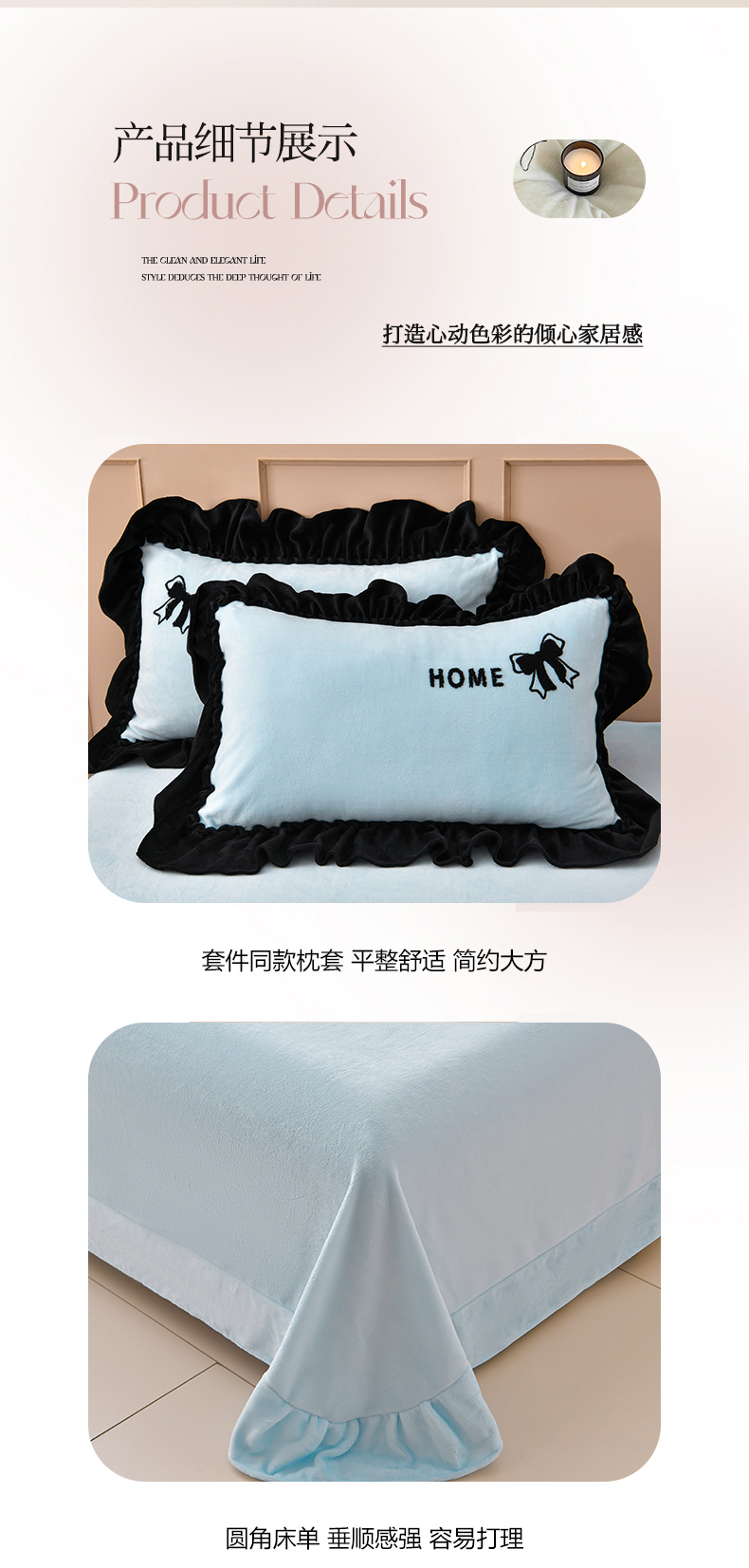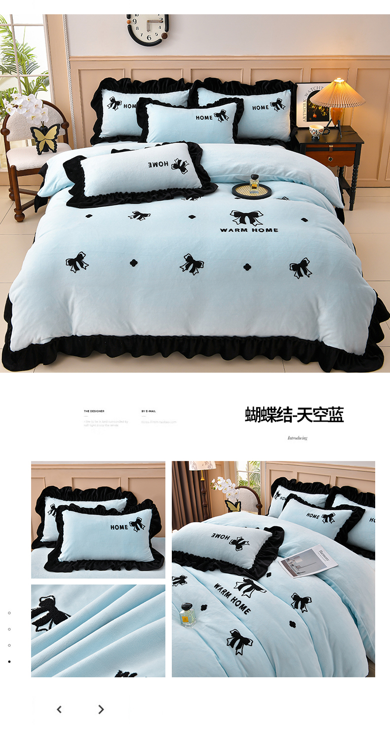 商品名称:梦之星 2025新款9斤毛巾绣韩式花边牛奶绒四件套 蝴蝶结-天空蓝