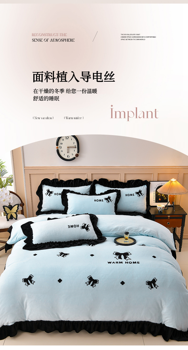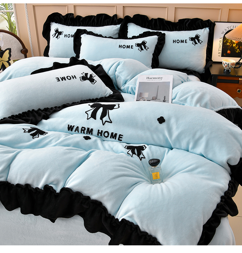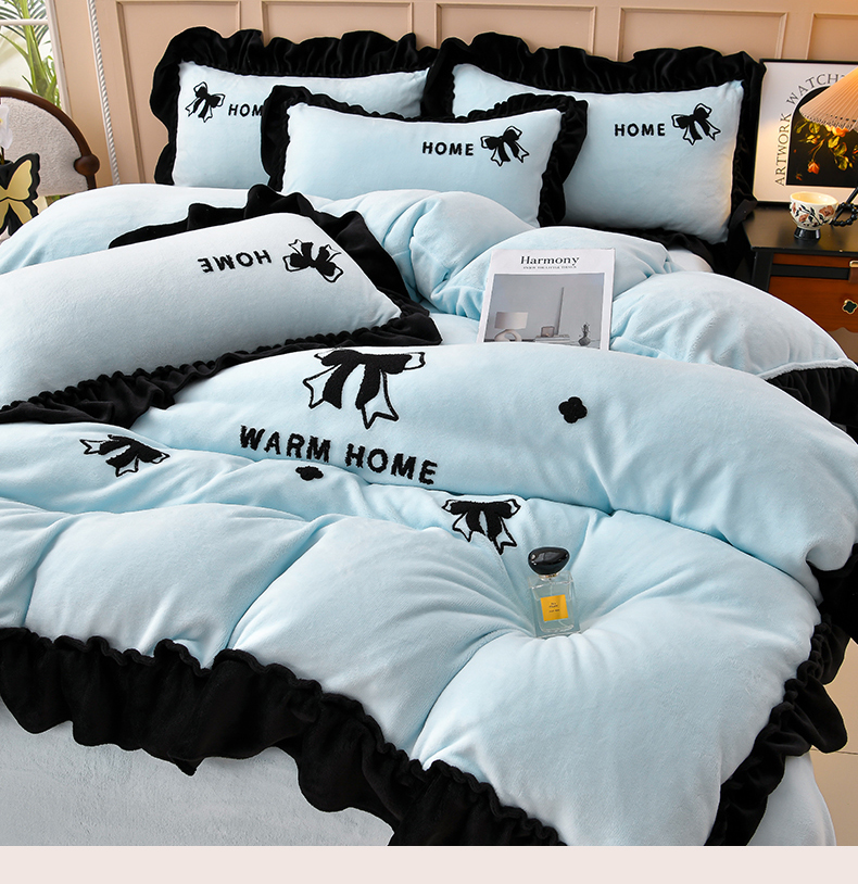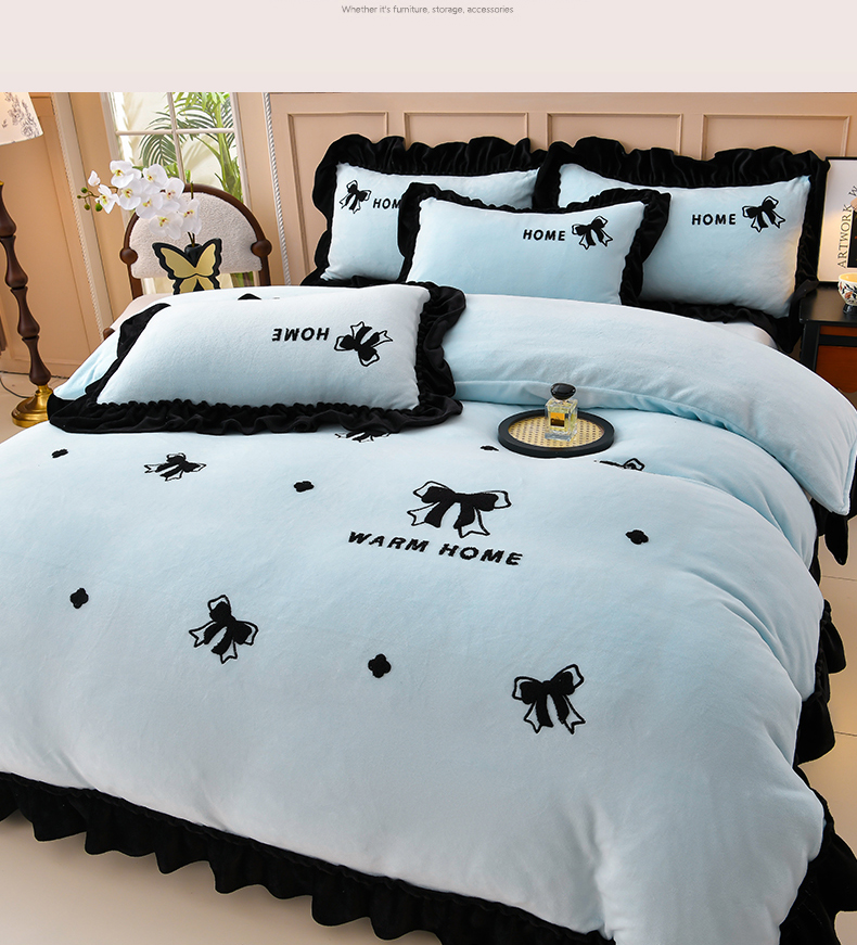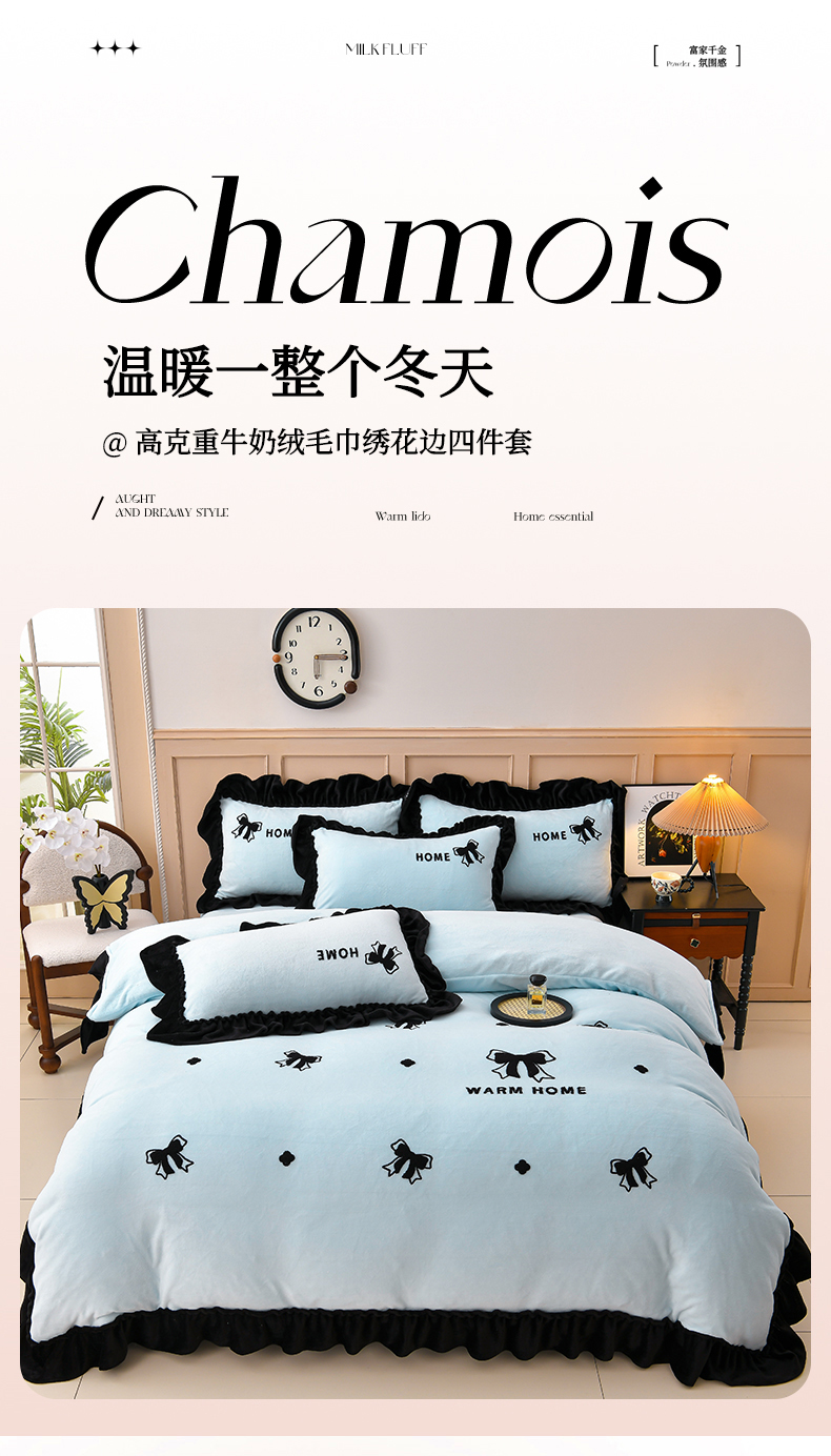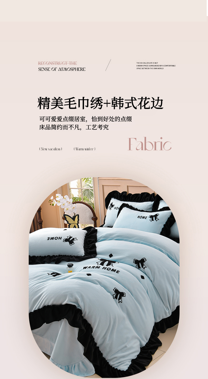 梦之星 2025新款9斤毛巾绣韩式花边牛奶绒四件套 蝴蝶结-天空蓝