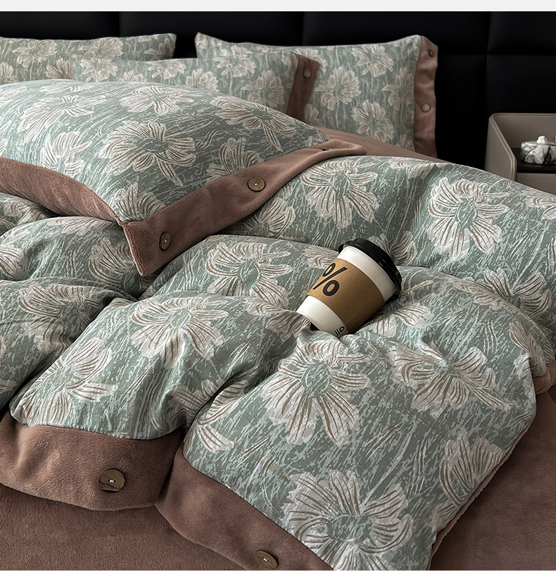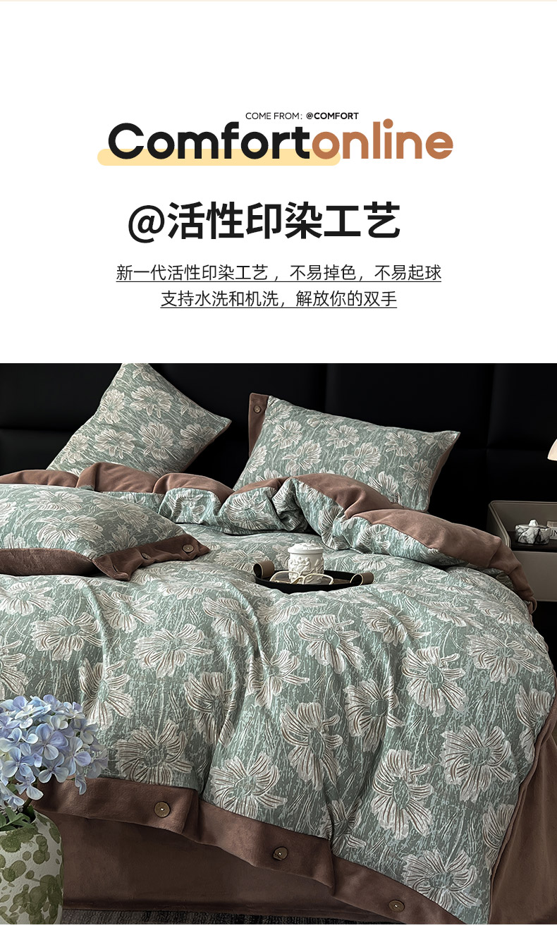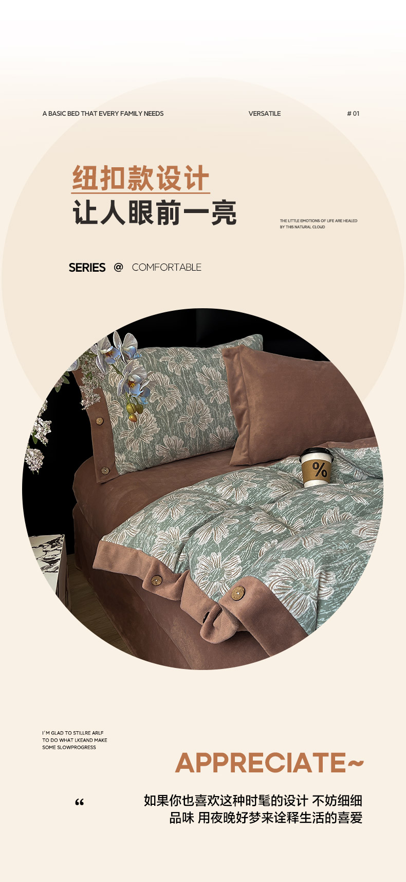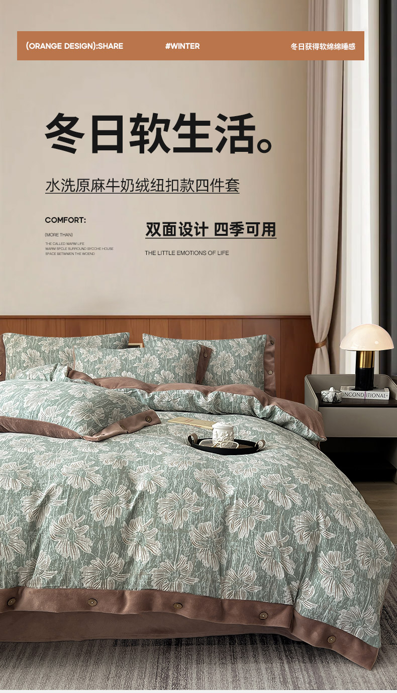 吾诺家居 2025新款水洗原麻牛奶绒纽扣款四件套 绍华