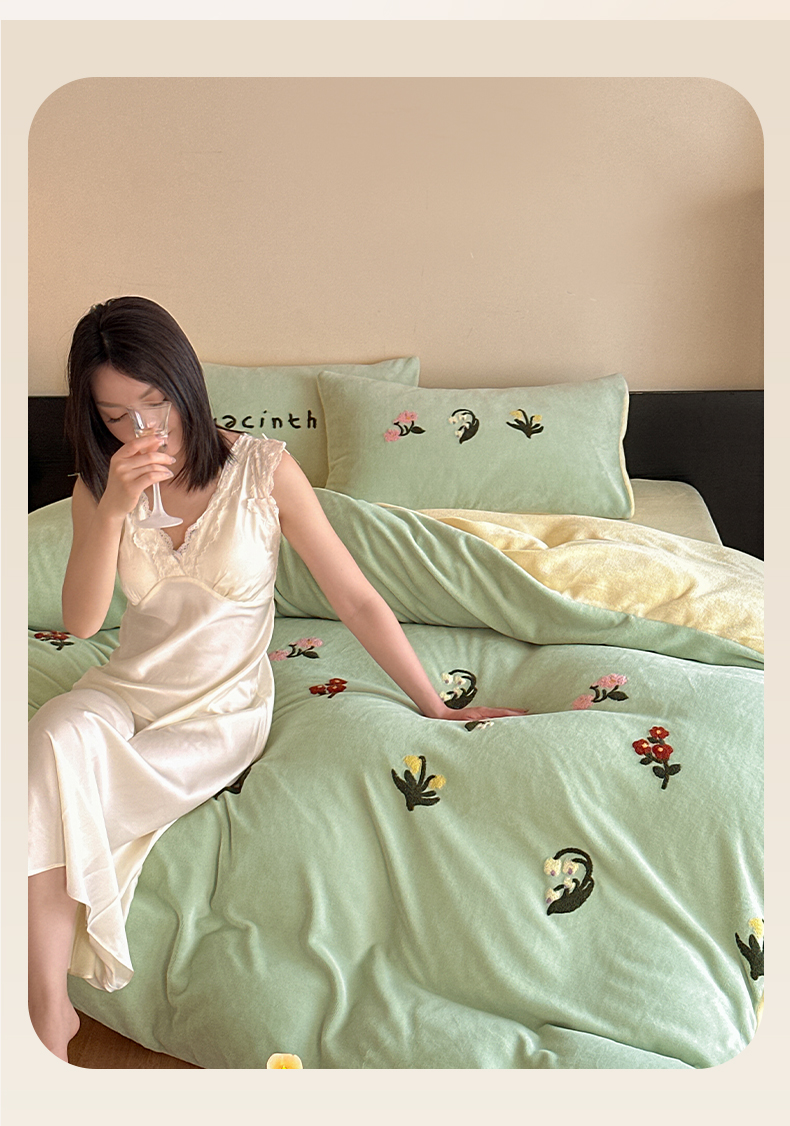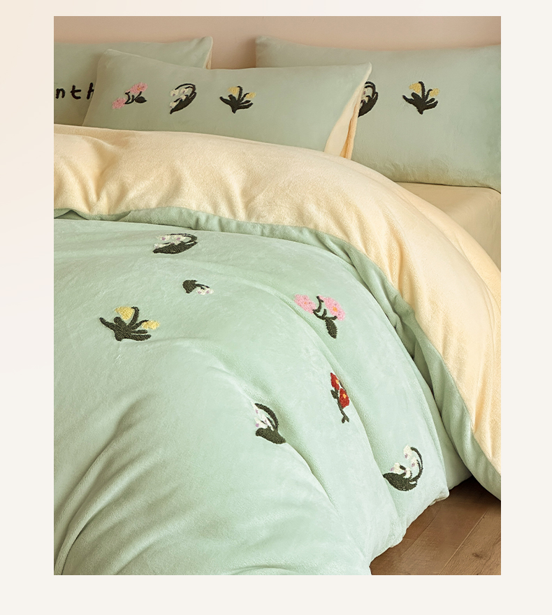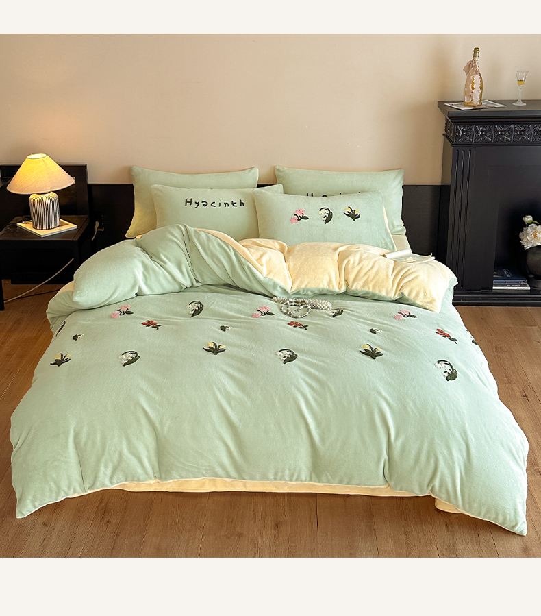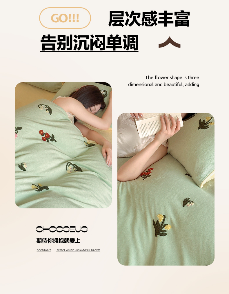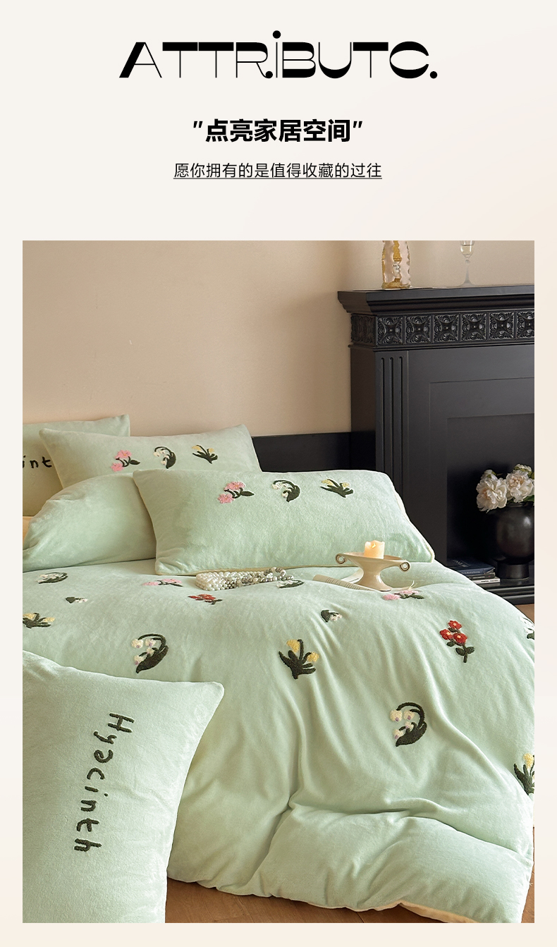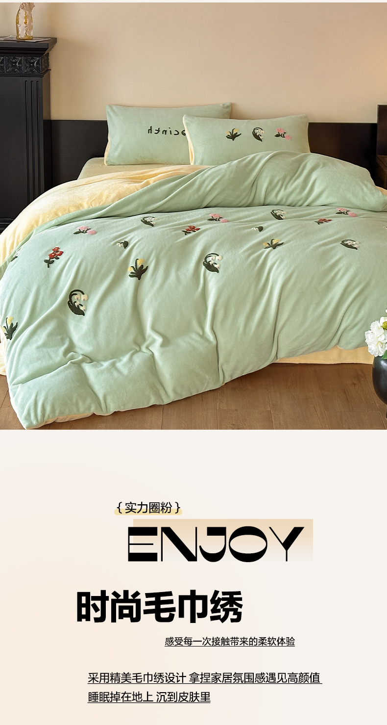 如一 2025新款田园风毛巾绣牛奶绒四件套 铃兰-绿黄