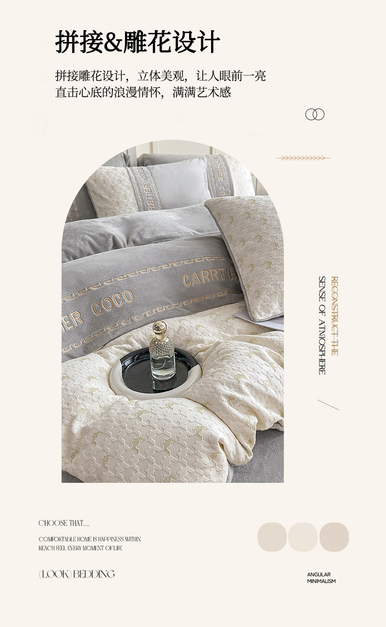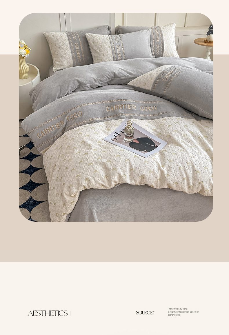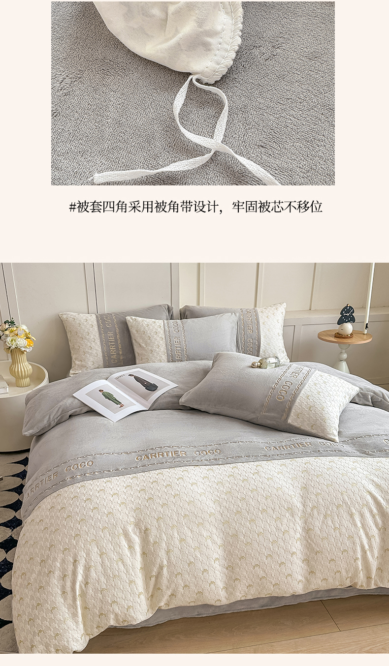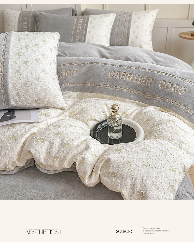 当前位置: 91家纺网 > 商品网购 > 床品套件 > 四件套 > 牛奶绒四件套 > 灰鲸 2025新款牛奶绒拼接刺绣雕花套件-贝娜 贝娜-纳多灰