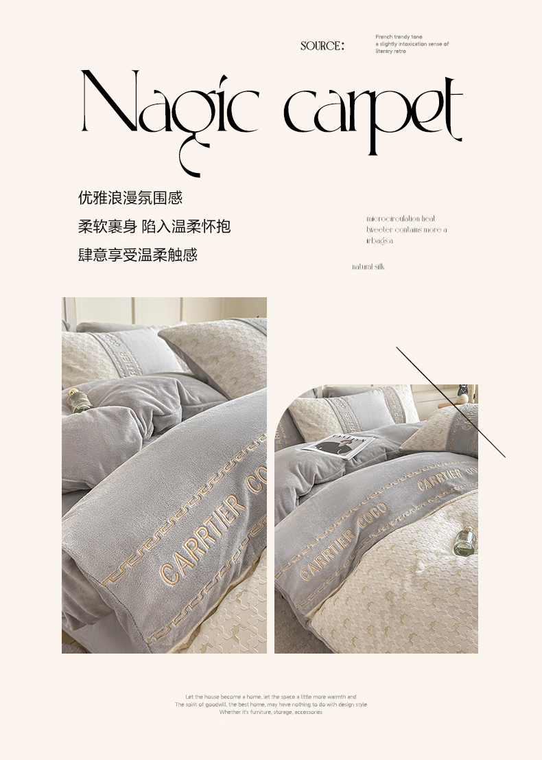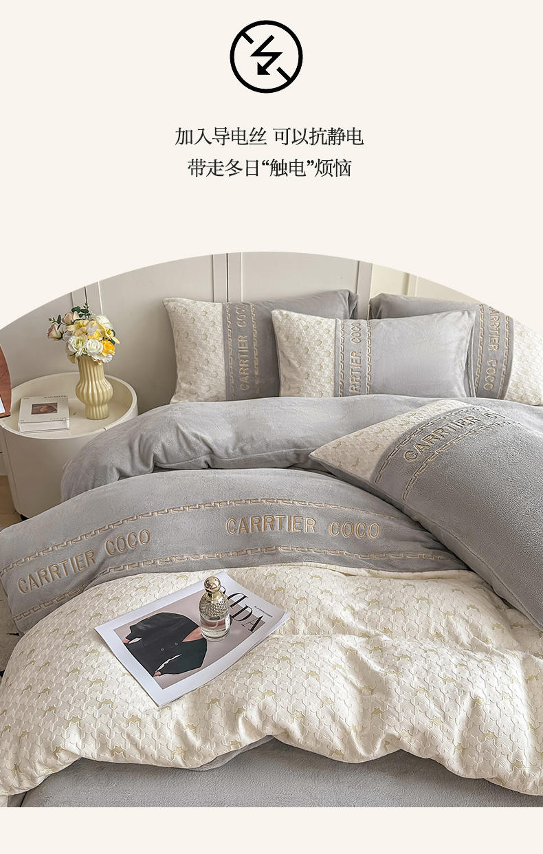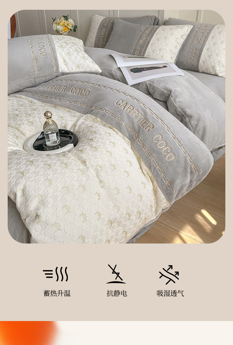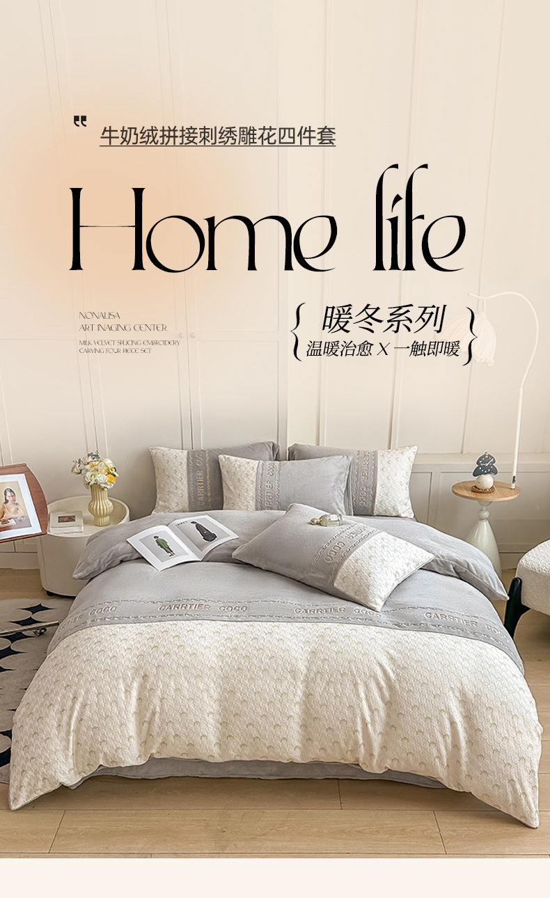 当前位置: 91家纺网 > 商品网购 > 床品套件 > 四件套 > 牛奶绒四件套 > 灰鲸 2025新款牛奶绒拼接刺绣雕花套件-贝娜 贝娜-纳多灰