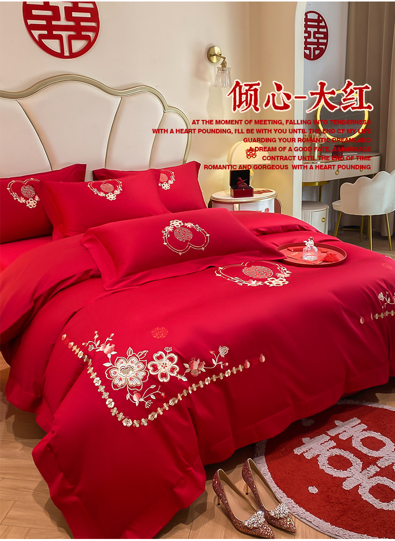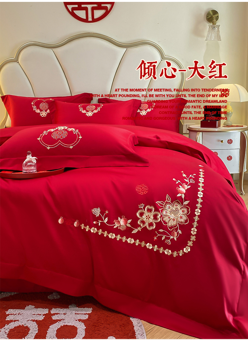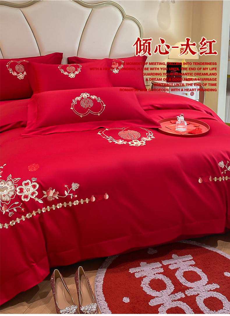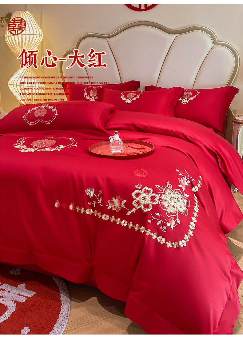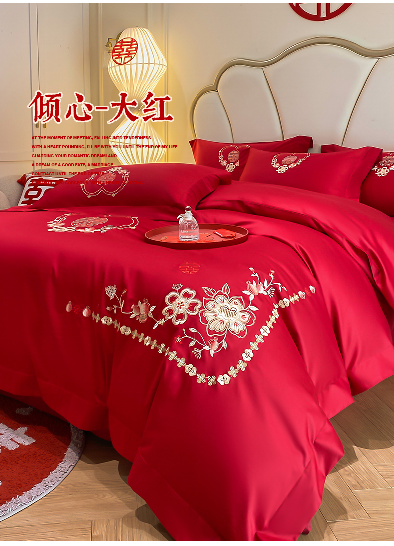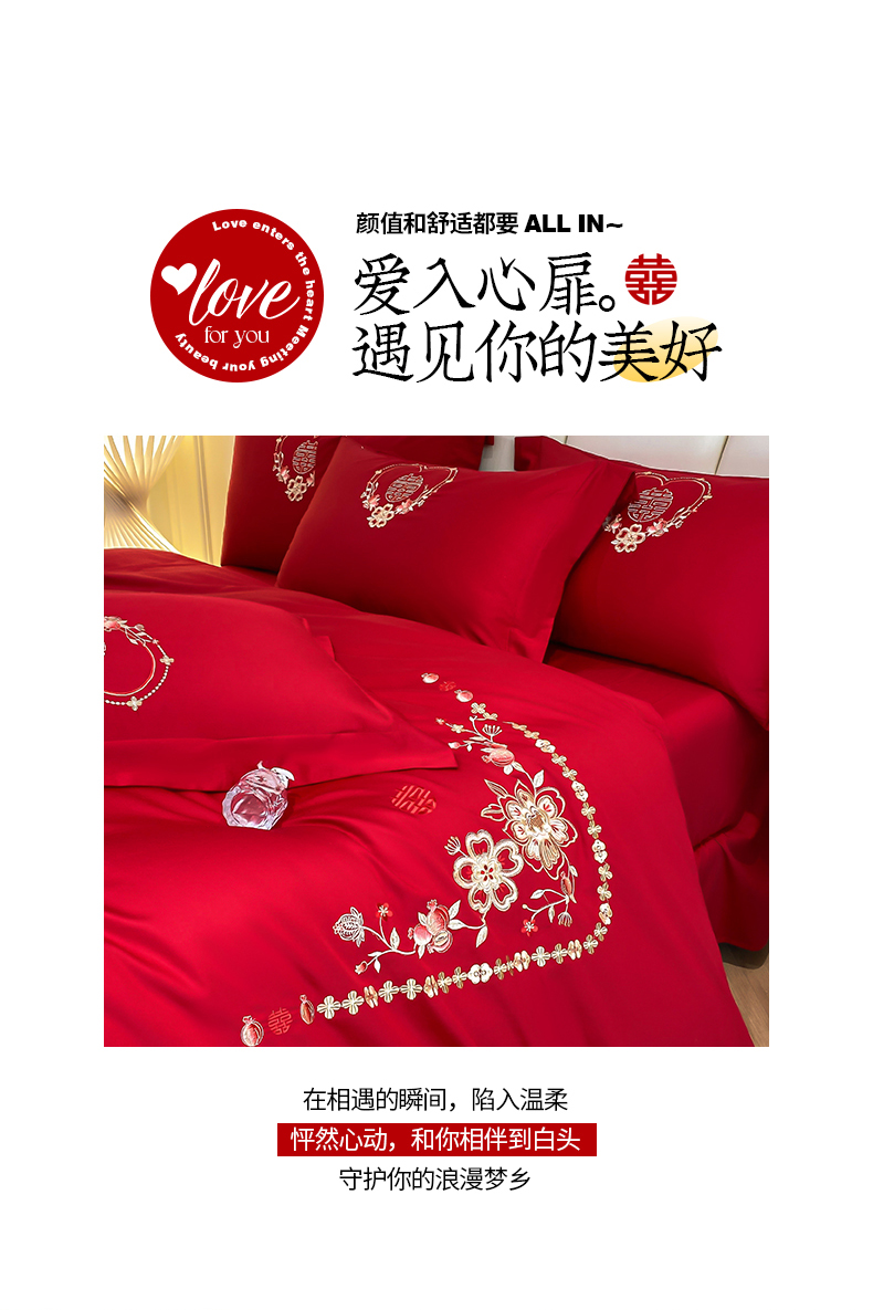 当前位置: 91家纺网 > 商品网购 > 床品套件 > 四件套 > 婚庆四件套 > 置顶家纺 2025新款亲肤磨毛刺绣婚庆四件套系列-棚拍 倾心-大红
