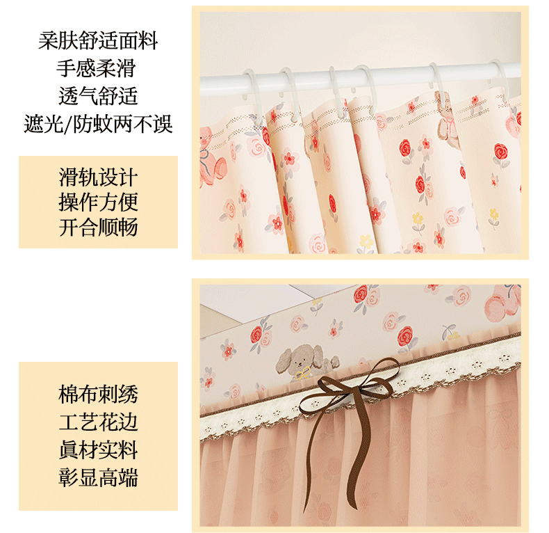 (总)艾晶美家纺有限公司 2025新款大版花卡通家用坐式遮光床帘蚊帐,欢乐熊,萌萌兔,帅气狗,音乐猫