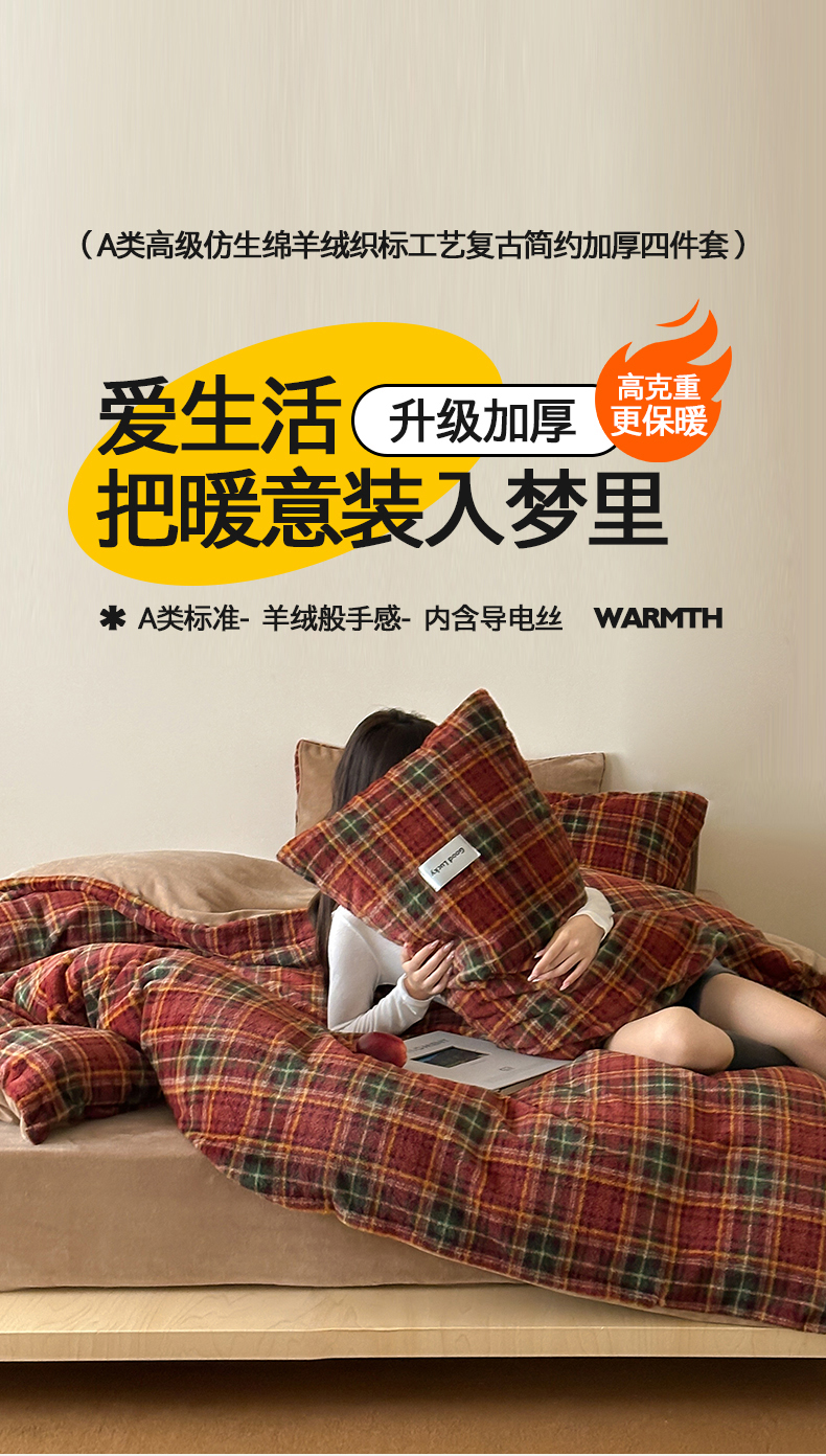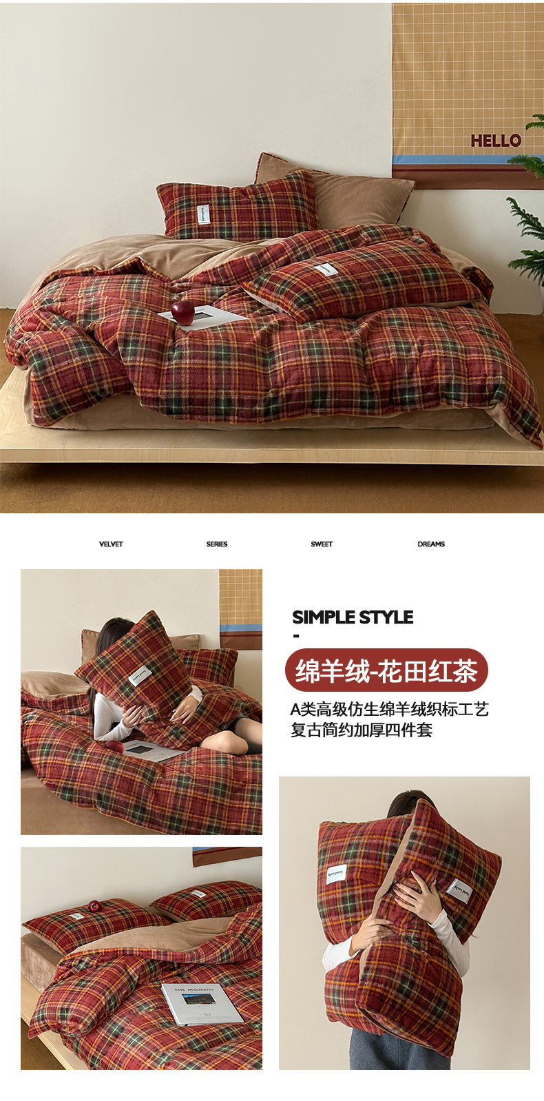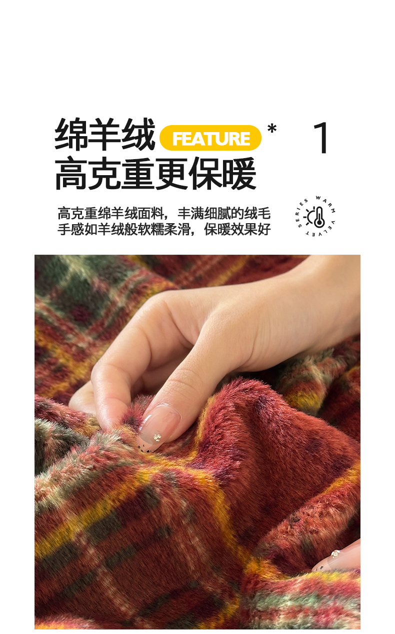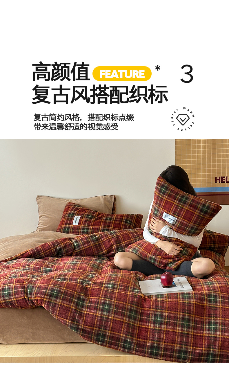 商品名称:桃子家居 2025新款A类高级仿生绵羊绒织标工艺复古简约秋冬限定款加厚牛奶绒系列四件套 绵羊绒-花田红茶