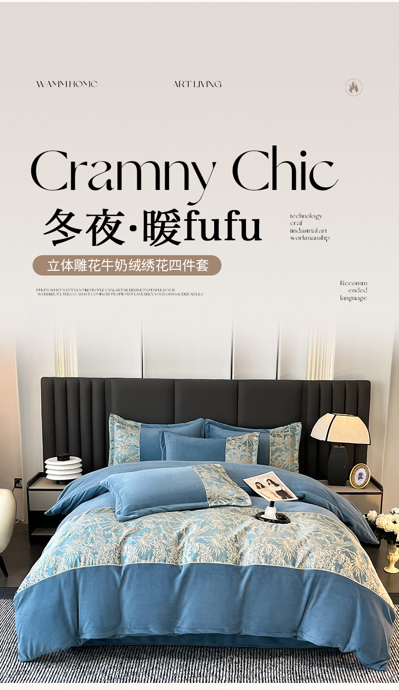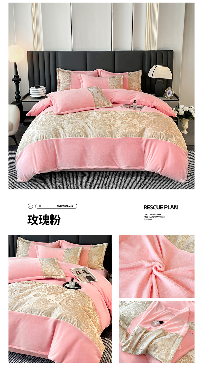 (总)富宁家纺 2025新款立体雕花牛奶绒绣花四件套-洛卡玫瑰系列,洛卡白,玫瑰灰,洛卡咖,玫瑰粉,洛卡蓝