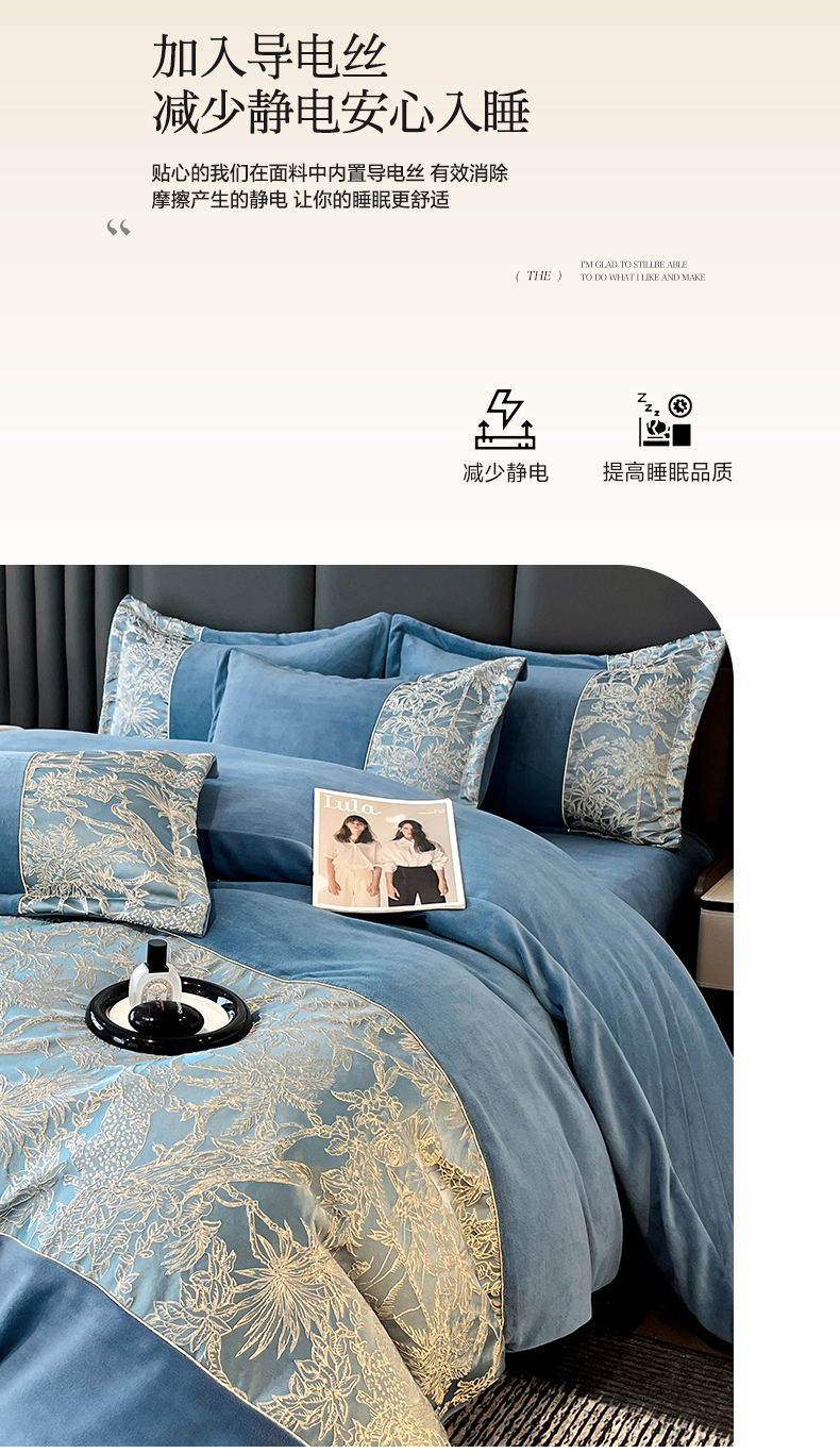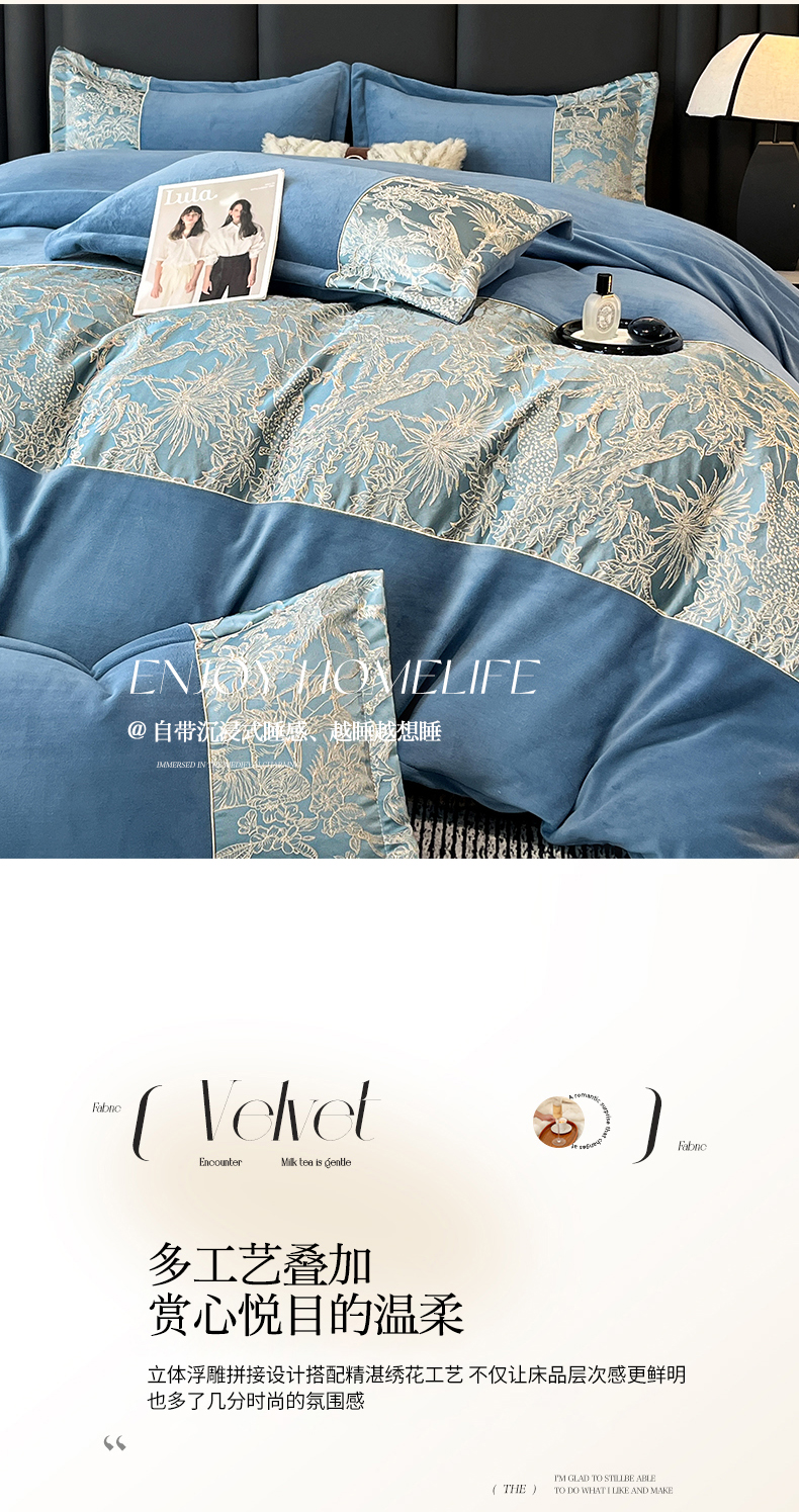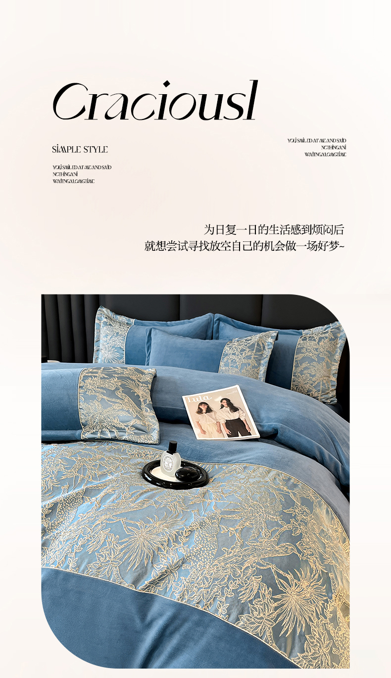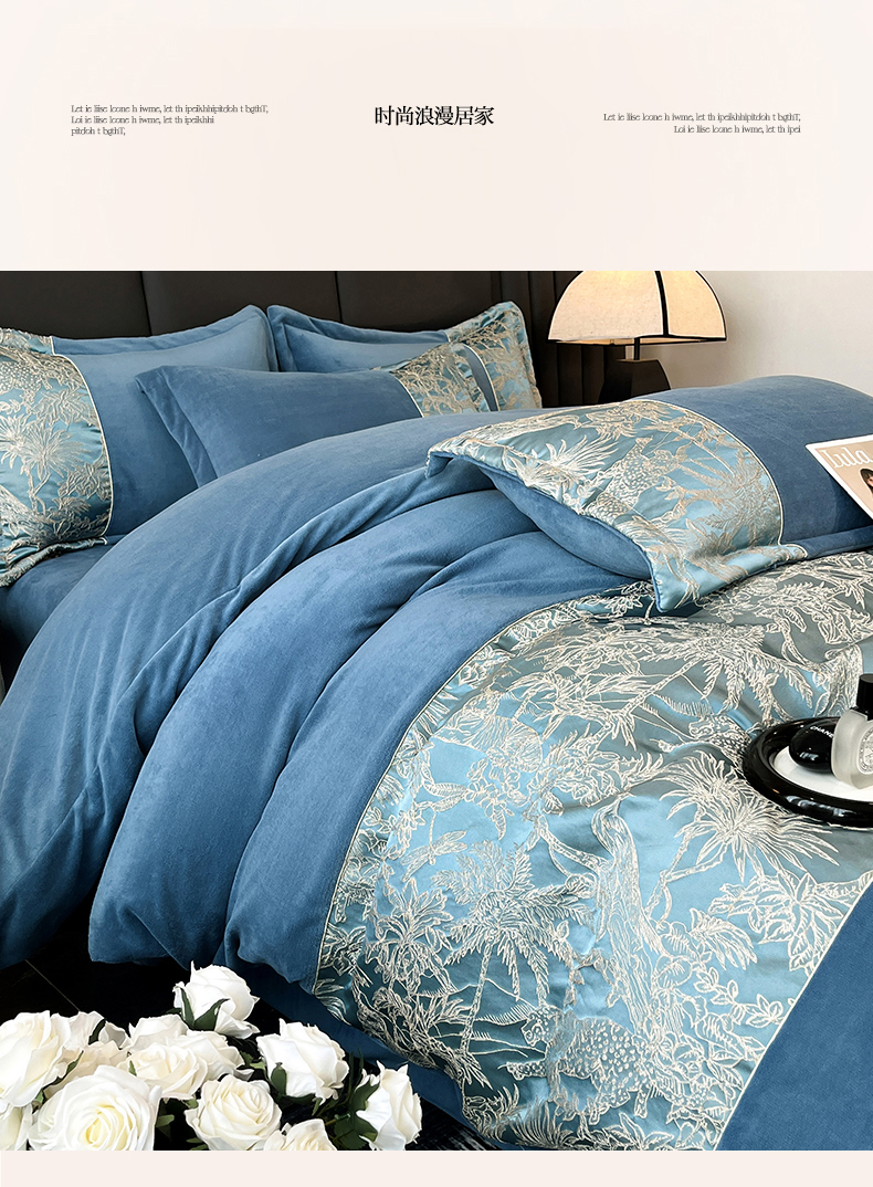 富宁家纺 2025新款立体雕花牛奶绒绣花四件套-洛卡玫瑰系列 洛卡蓝
