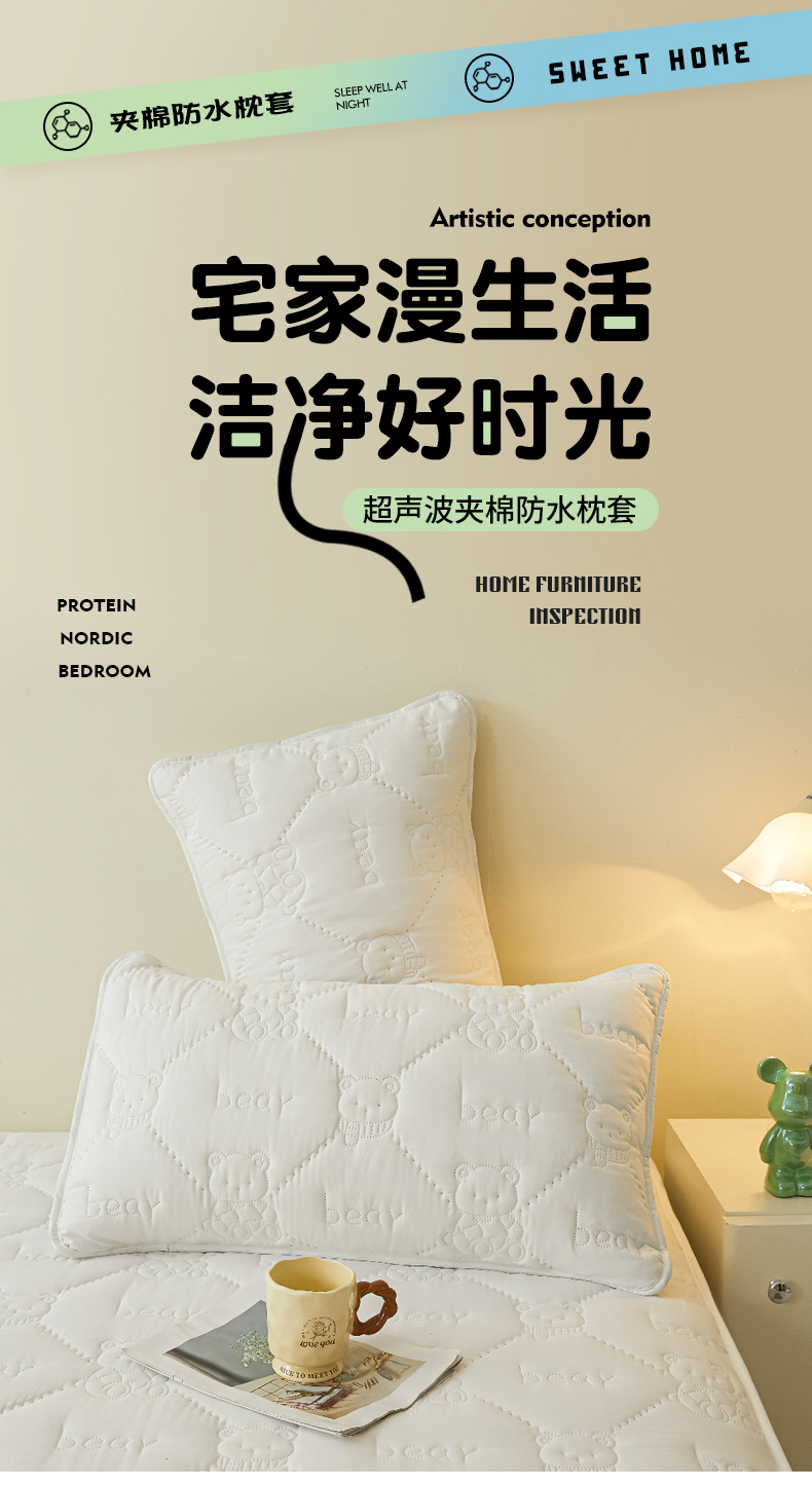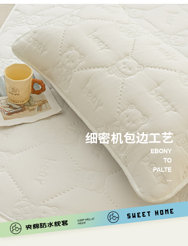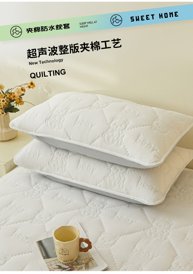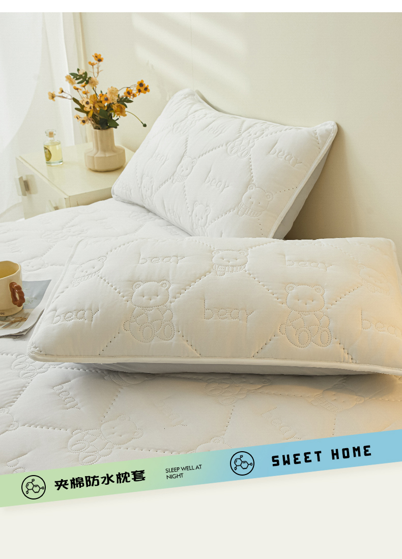 • 91家纺网 家纺一手货源 找家纺 LIFE.丽芙 2025新款磨毛超声波夹棉防水枕套机包边款 小熊防水夹棉枕套-象牙白