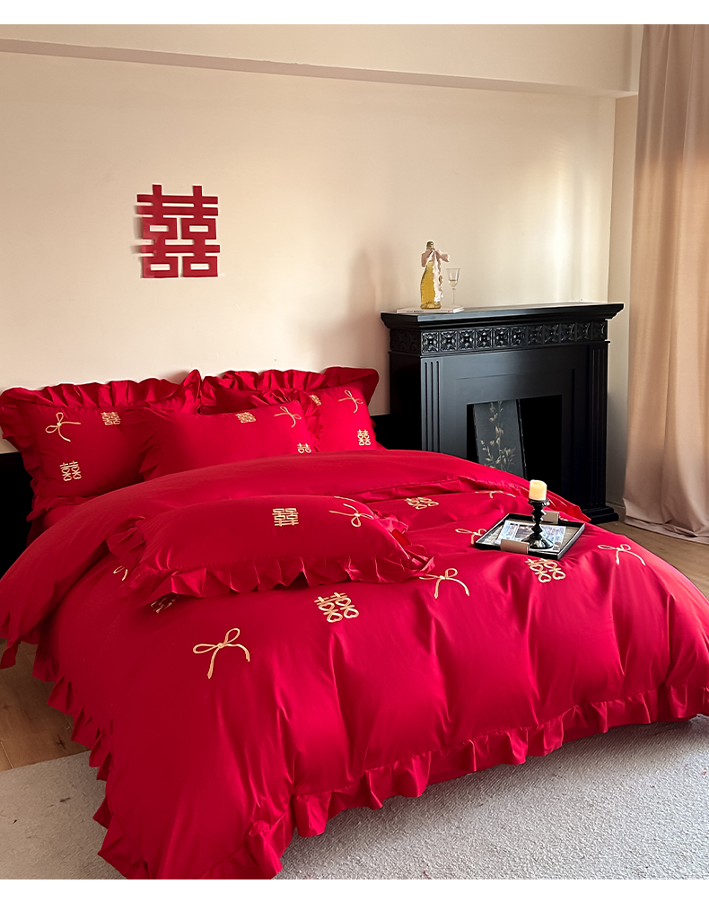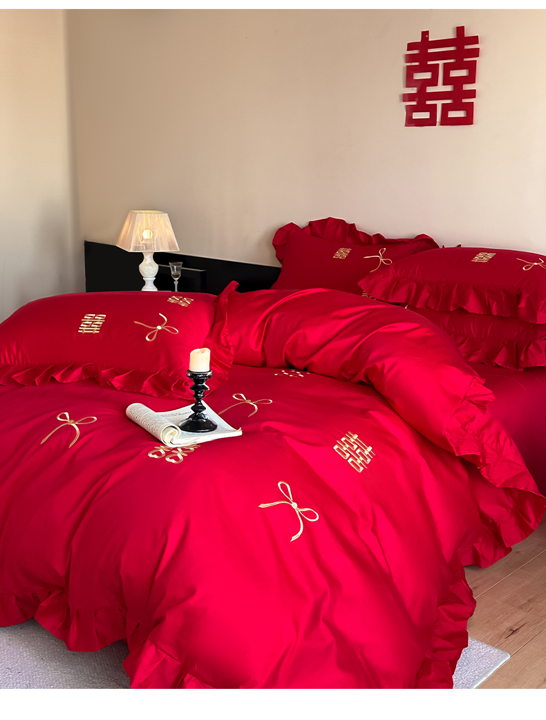 (总)欧乐蒂 2025新款亲肤棉刺绣花边婚庆四件套-浪漫花季,浪漫花季-红,浪漫花季-金