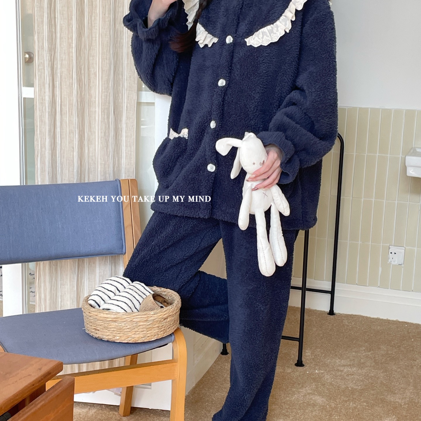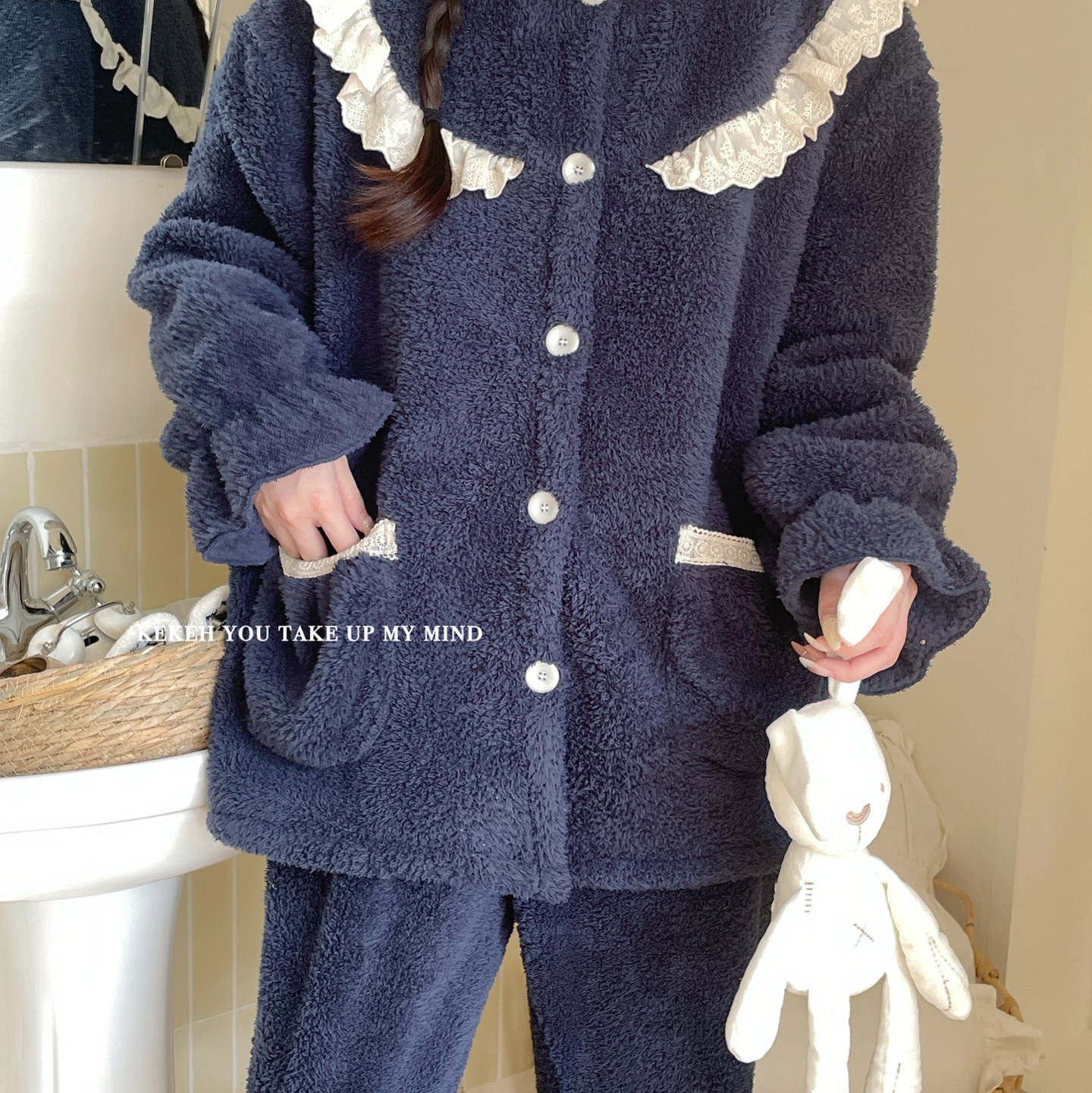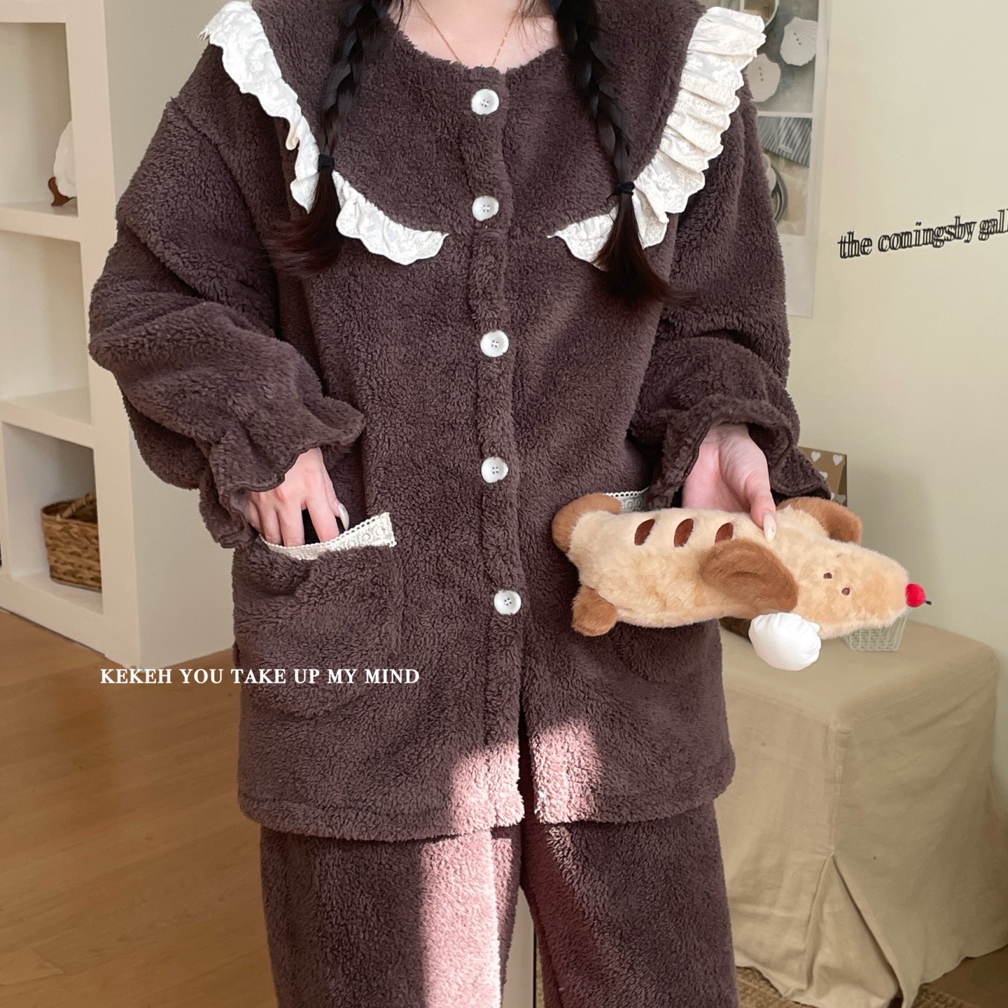 妍景家居生活馆 2025新款韩系圆领纽扣蕾丝套装 奶杏色