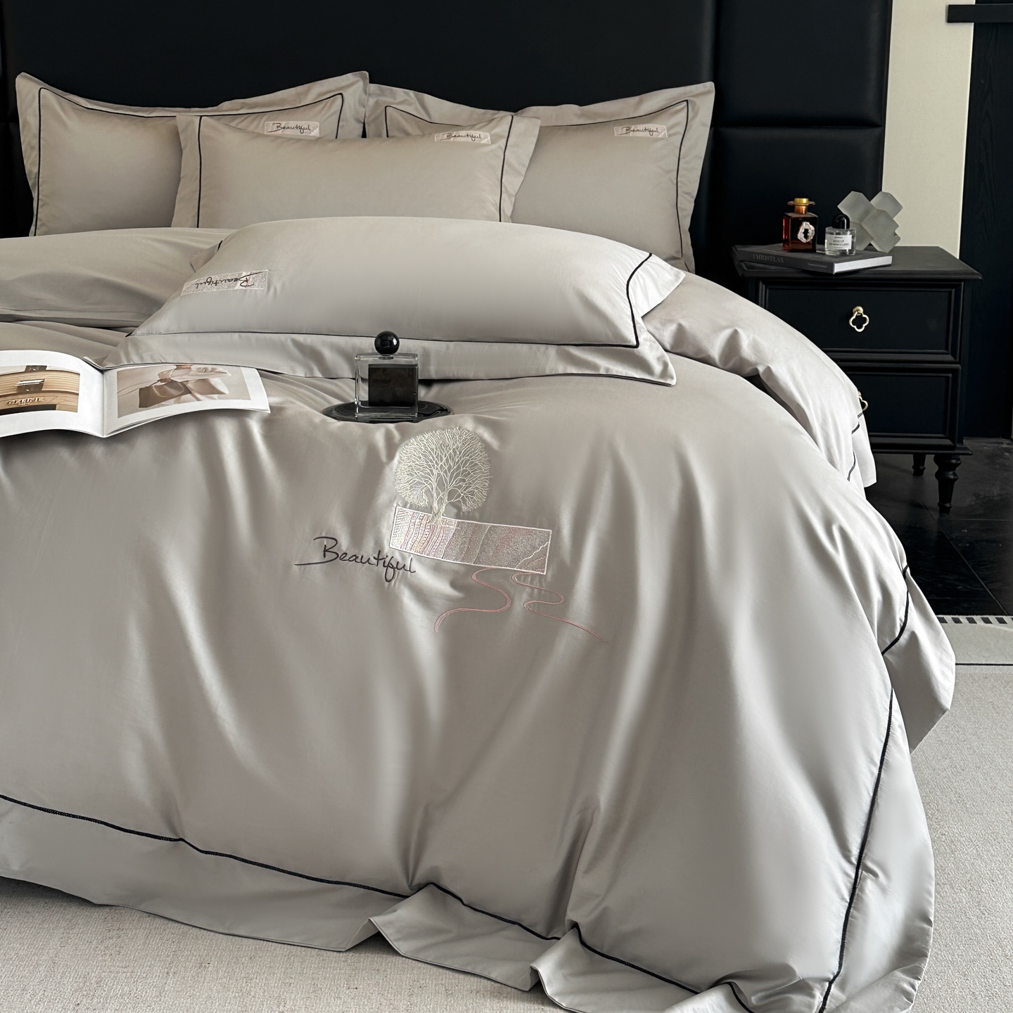 商品名称:新方向 2025新款刺绣全棉100s贡缎长绒棉四件套-往事 往事-爵士灰
