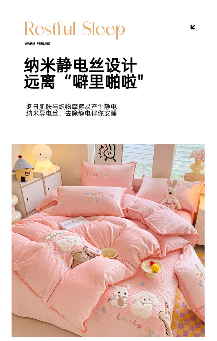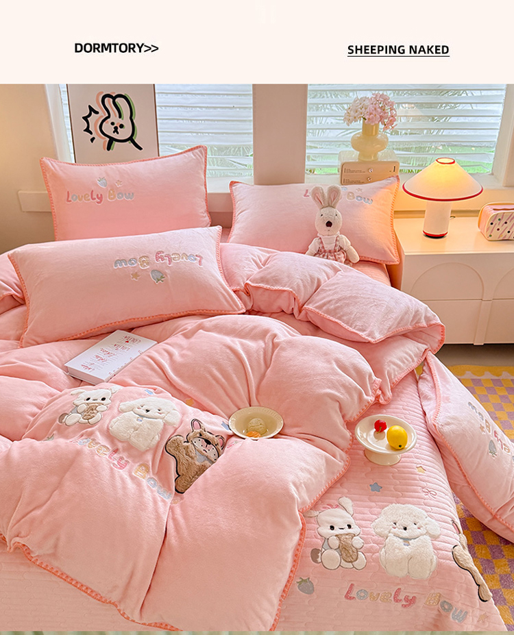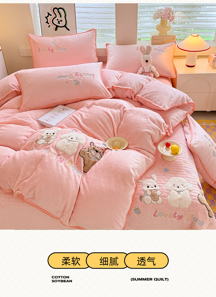 苏米娜家纺2025新款230g全消光大版卡通牛奶绒兔毛贴布绣花四件套可爱卡通男孩女孩法莱绒被套三件套 笑脸熊