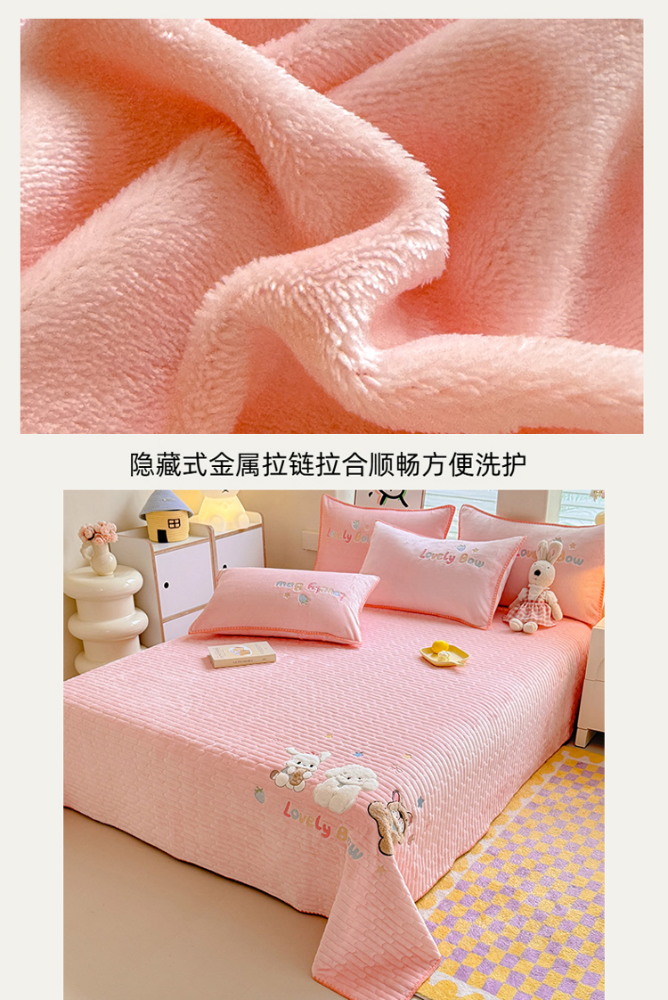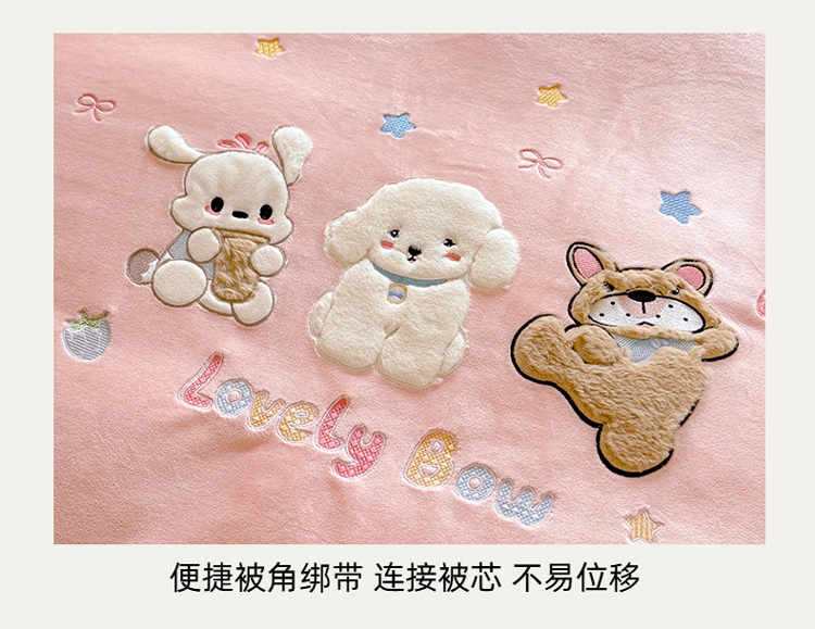 商品名称:苏米娜家纺2025新款230g全消光大版卡通牛奶绒兔毛贴布绣花四件套可爱卡通男孩女孩法莱绒被套三件套 笑脸熊