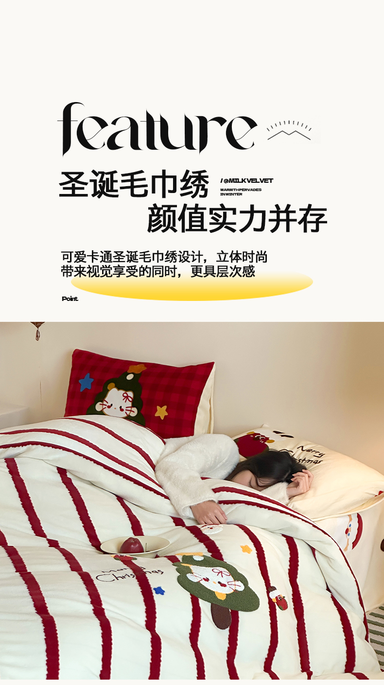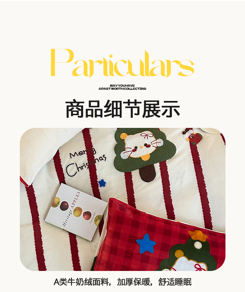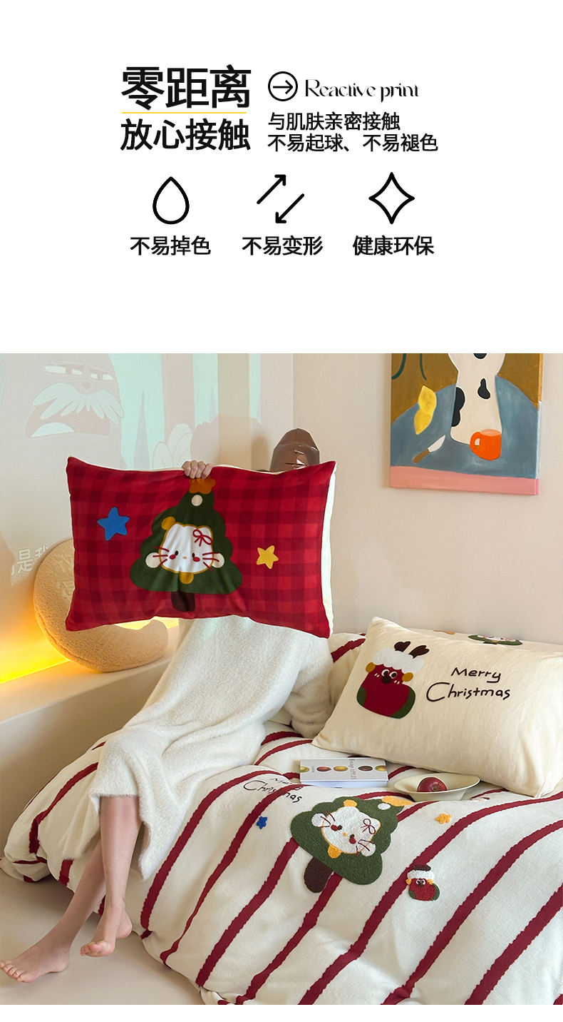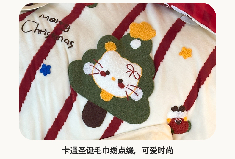 当前位置: 91家纺网 > 商品网购 > 床品套件 > 四件套 > 牛奶绒四件套 > 桃子家居 2025新款A类毛巾绣立体数码印花可爱卡通圣诞印加绣加厚牛奶绒系列四件套 绒印加绣-安哥拉红条猫咪