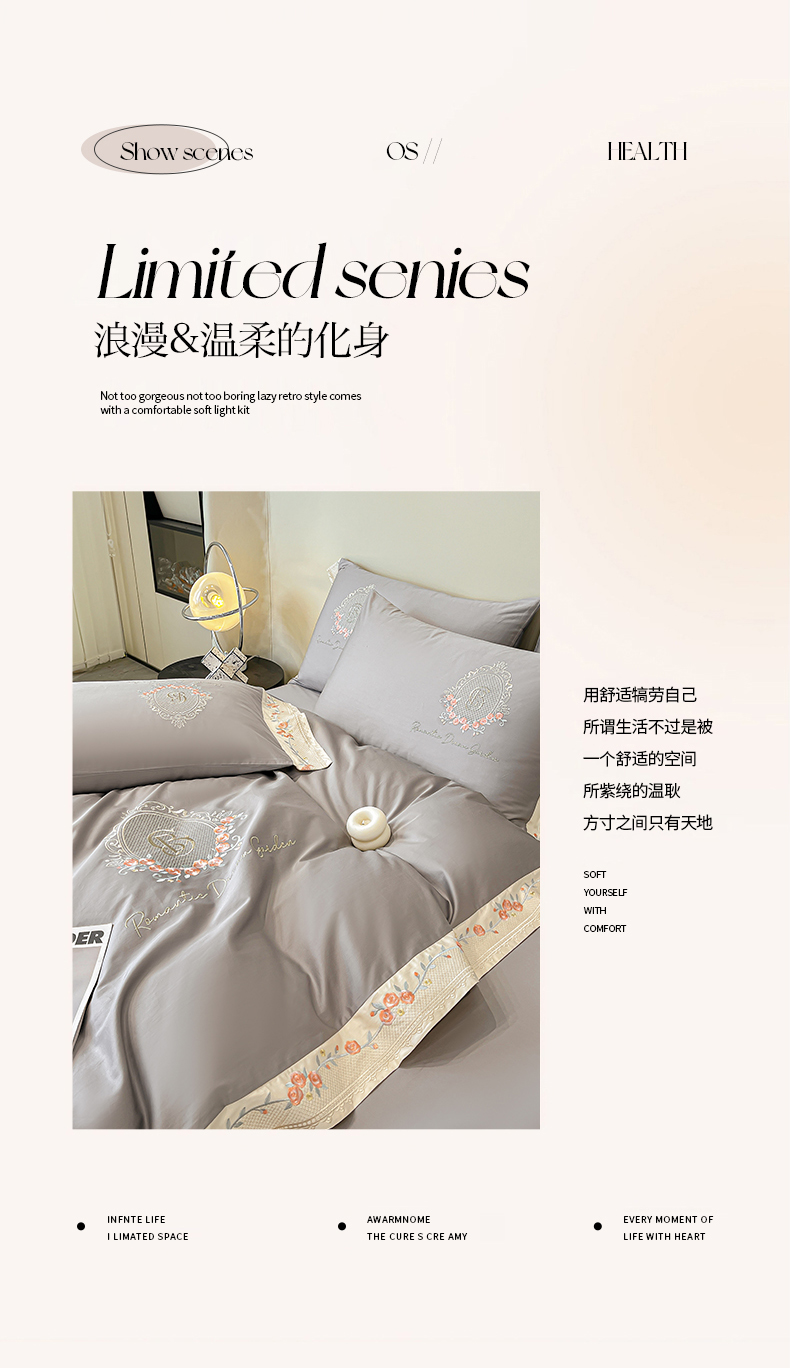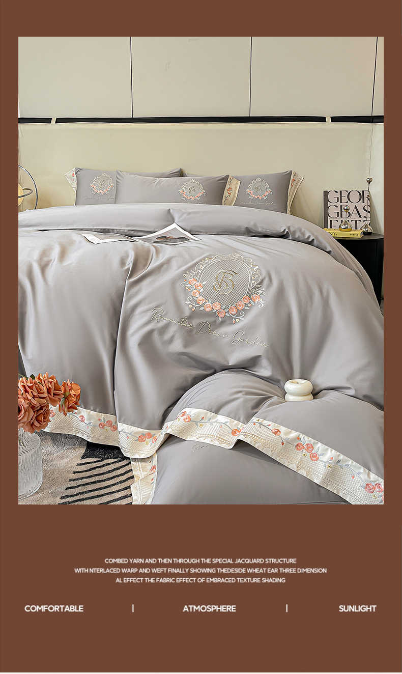 商品名称:欣宜家纺 2025新款纯棉全棉长绒棉刺绣绣花四件套轻奢床上用品套件-叶语系列 绅士灰