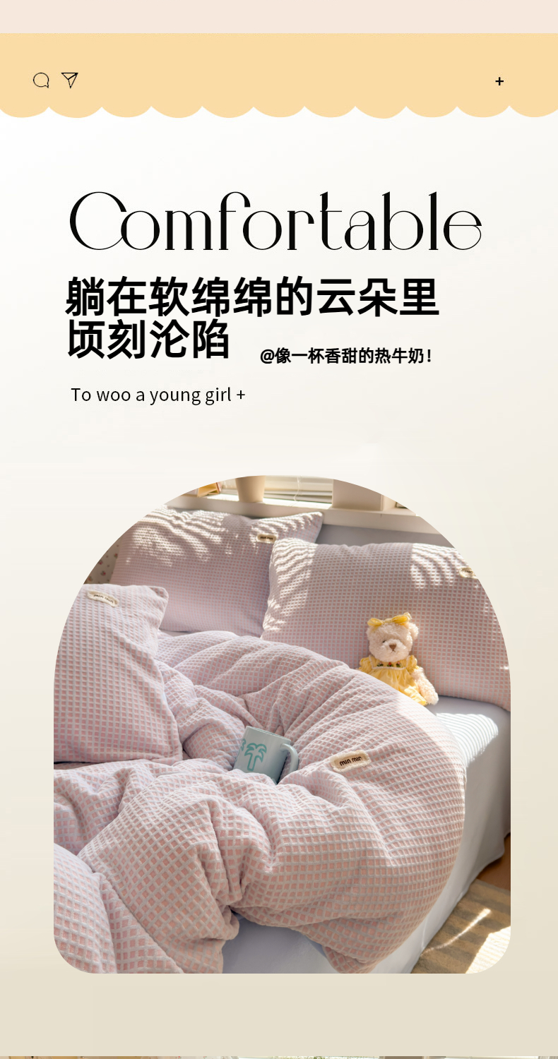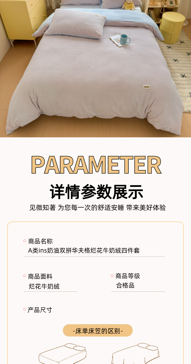 商品名称:欣宜家纺 2025秋冬新款ins奶油风双拼华夫格烂花雕花绒牛奶绒四件套 华夫格-绿紫