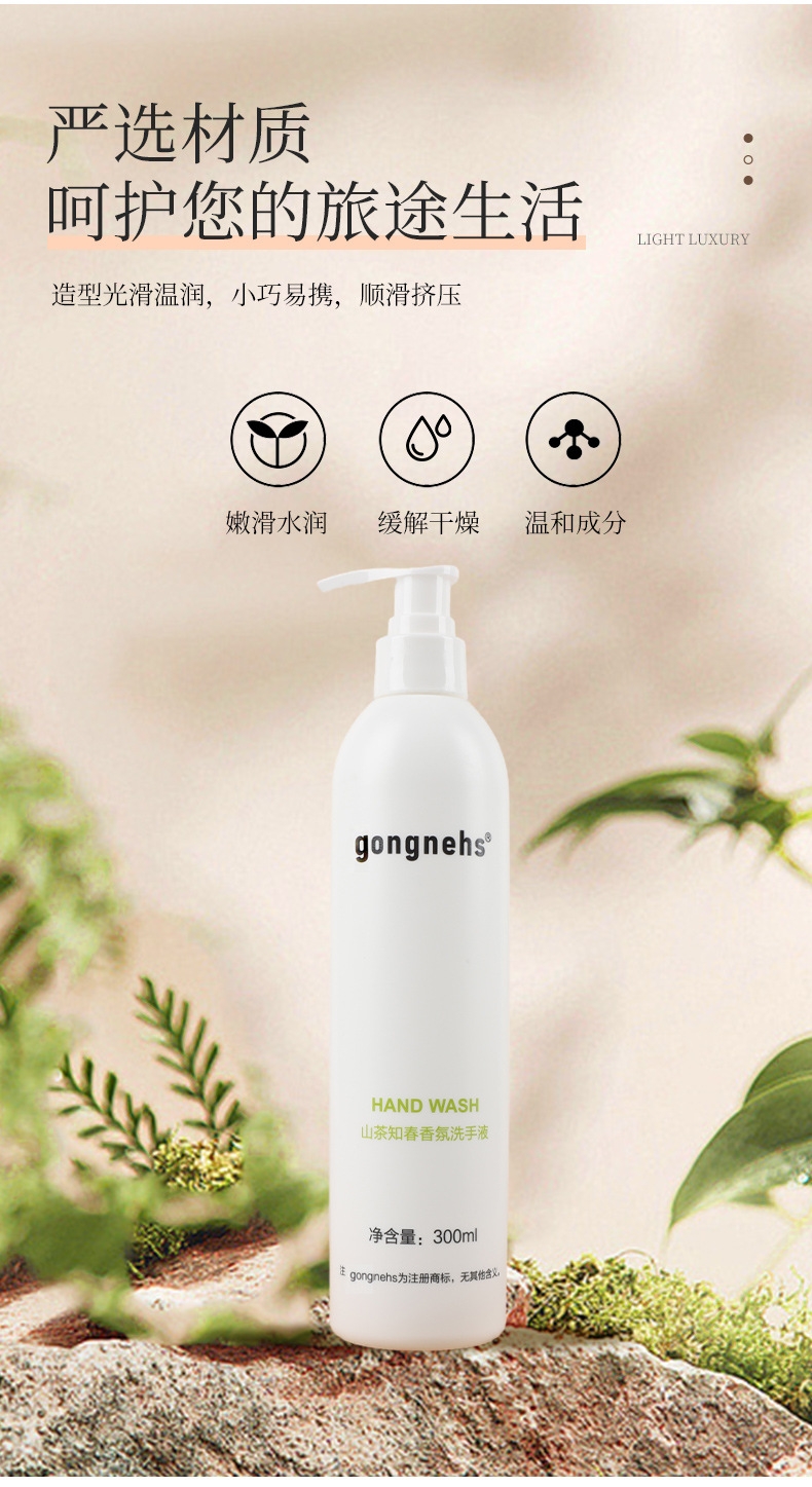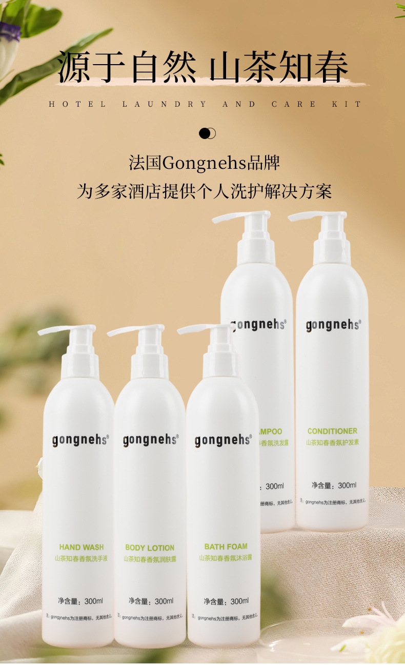 当前位置: 91家纺网 > 商品网购 > 居家日用 > 其他分类 > 安力森/诚臻酒店用品 2026新款山茶知春酒店洗沐护五件套 300ml大瓶装洗发水沐浴露护发素润肤露 法国Gongnehs山茶知春精油洗沐护用品 护发素300ml/瓶