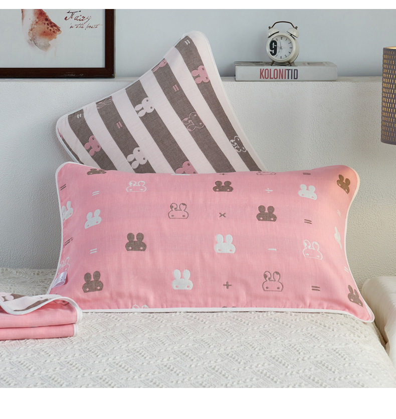 朴尔家纺-毛巾被 2026新款六层纱布全棉循环小花型枕巾 算数小兔粉枕巾