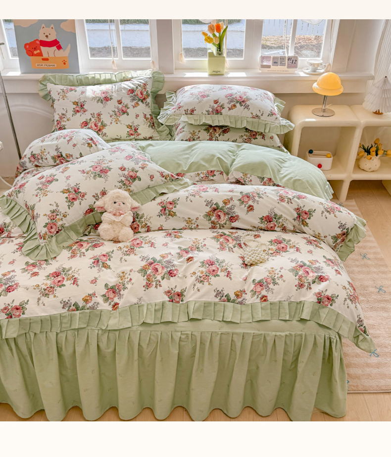 当前位置: 91家纺网 > 商品网购 > 床品套件 > 四件套 > 全棉普通四件套 > 缦彩 2026新款纯棉花卉公主风大花边床裙四件套 梵夕