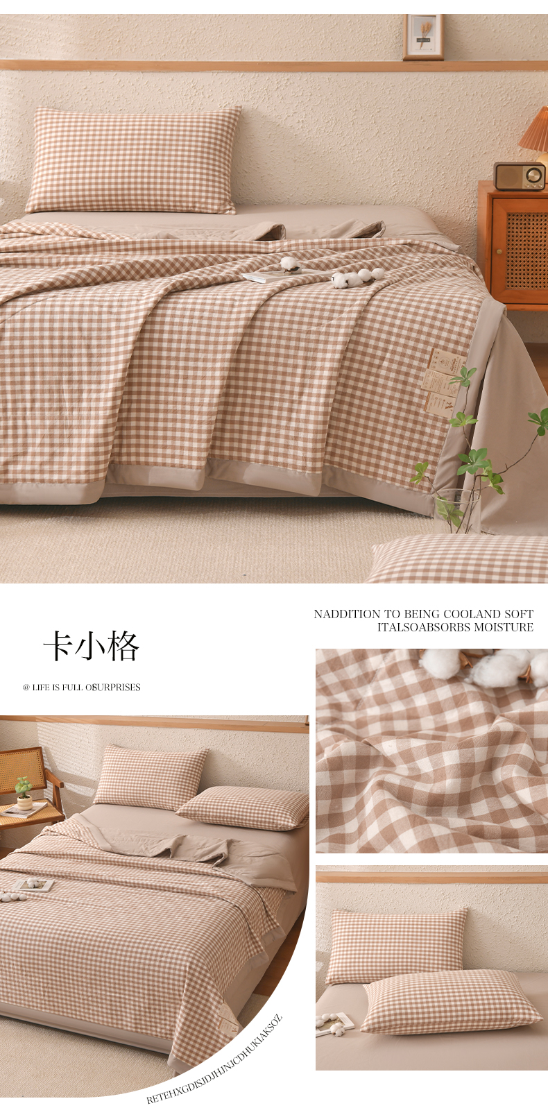 当前位置: 91家纺网 > 商品网购 > 被子 > 夏被 > 培童家纺 2026新款全棉色织水洗棉A类棉花夏被可机洗空调被四件套床单枕套 棕小格