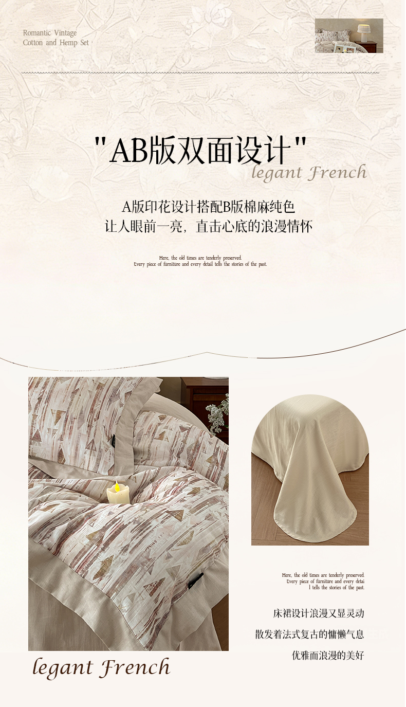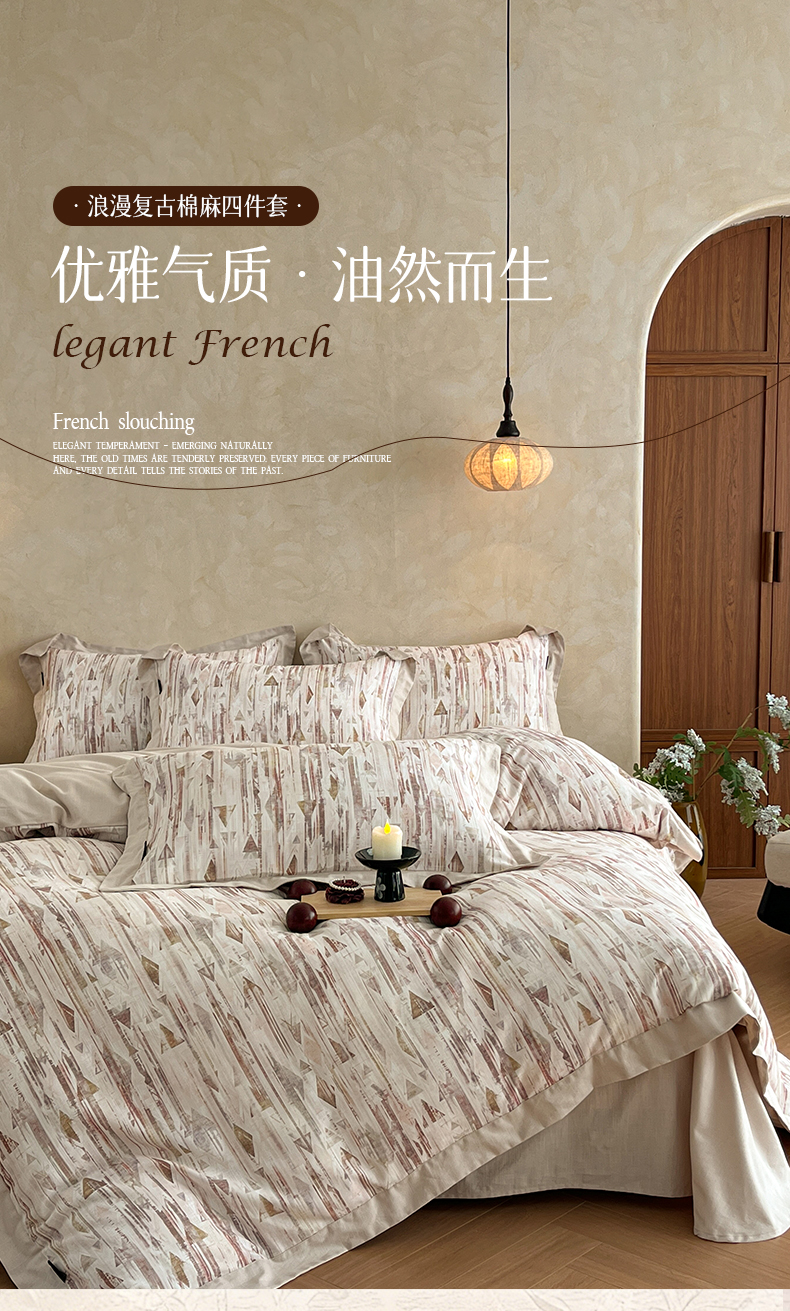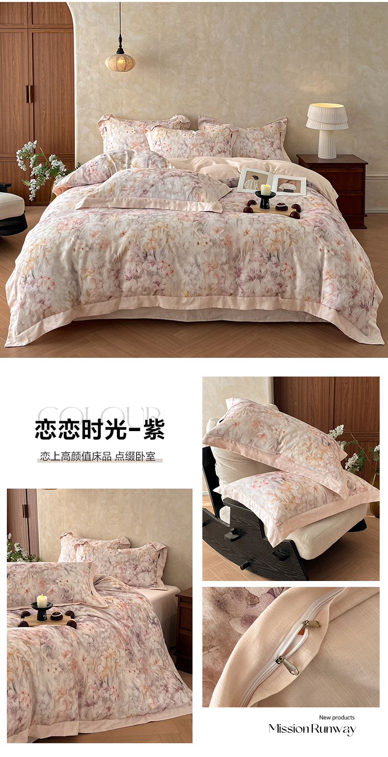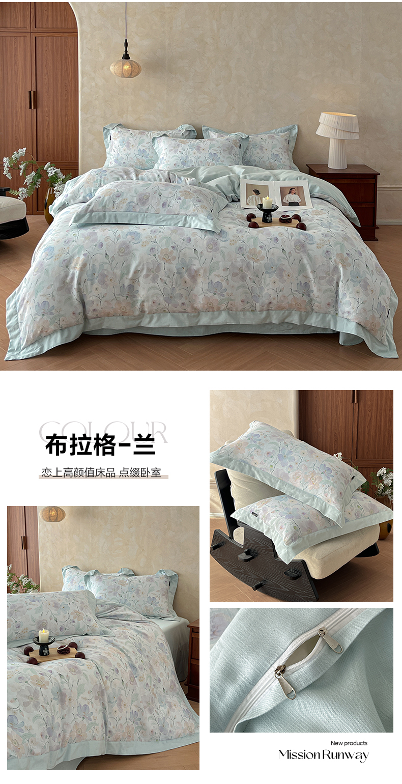 (总)金昱纺 2026新款拼角工艺款数码印花棉麻四件套,薇光-兰,布拉格-兰,辰梦-绿,恋恋时光-紫,梦幻巴黎-灰,岁晚-咖,万川-咖,叶璃-咖