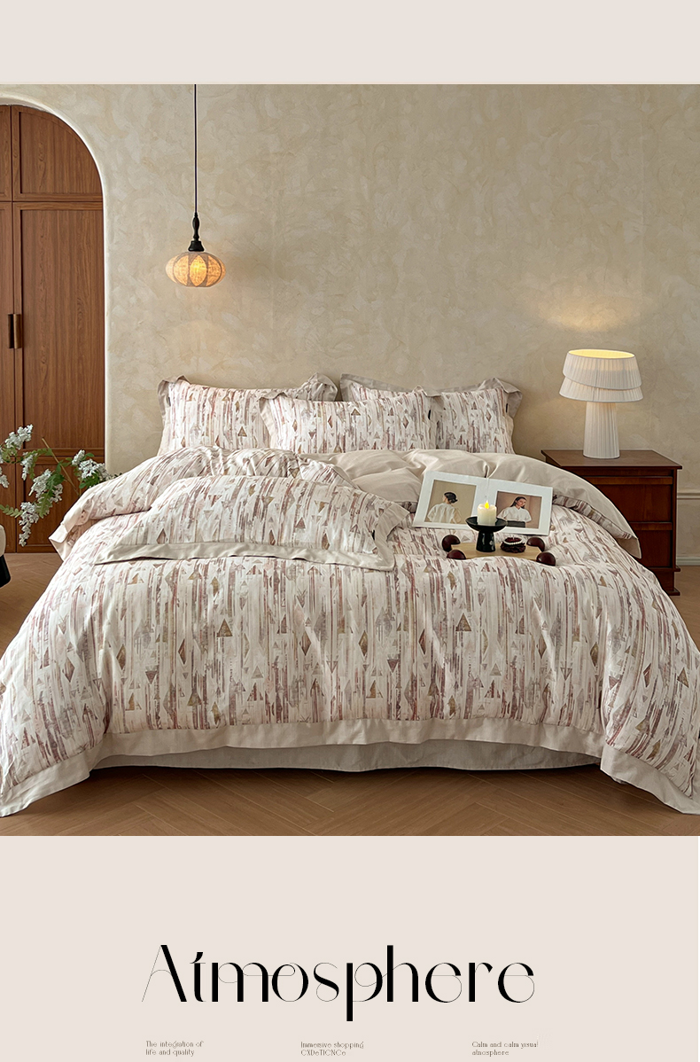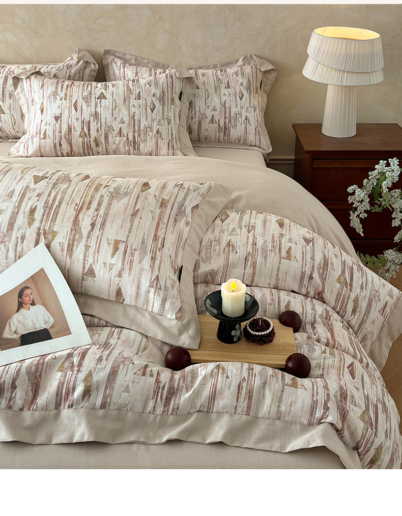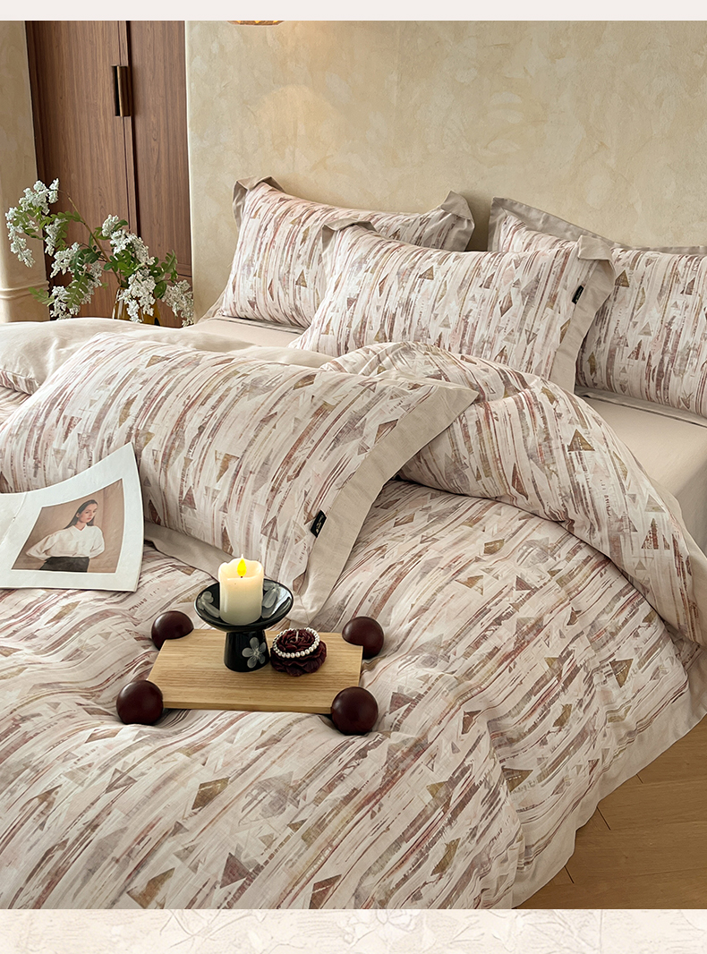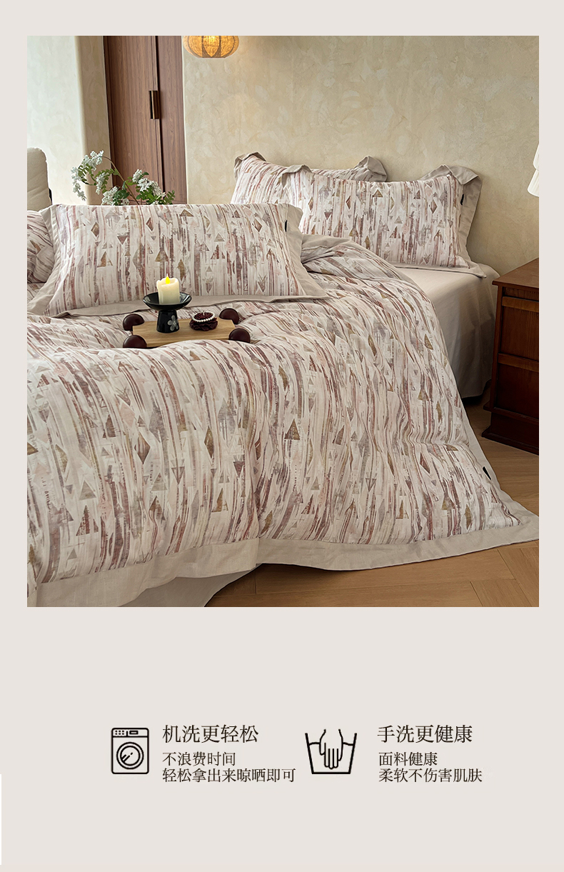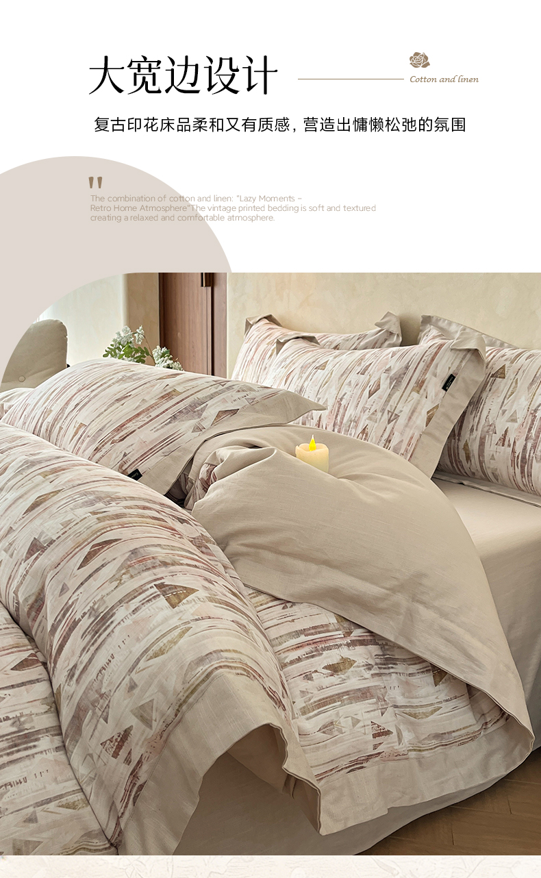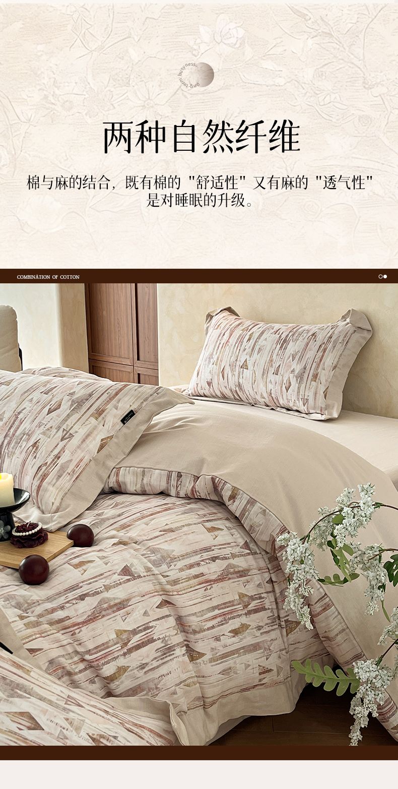 商品名称:金昱纺 2026新款拼角工艺款数码印花棉麻四件套 万川-咖