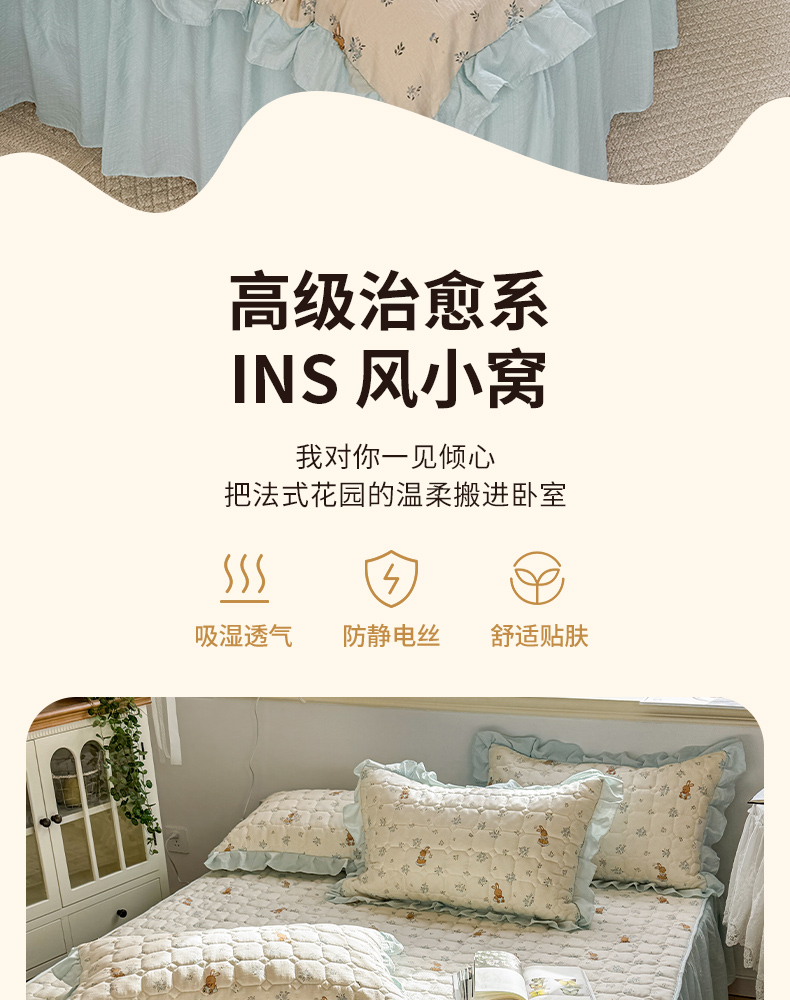(总)禧缘家纺(原梦想家) 2026新款小清新皱皱纱木棉床裙式床笠印花三件套,彩虹,蝶梦,花田,沐春,南瓜,泡芙,甜筒,童话,兔兔,雾迟,星星,月光