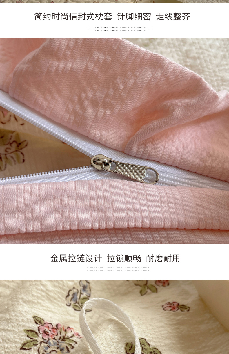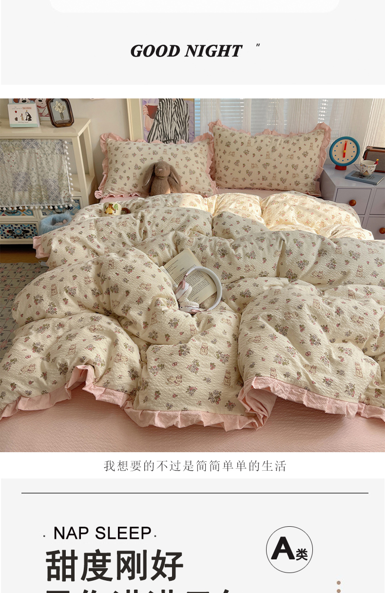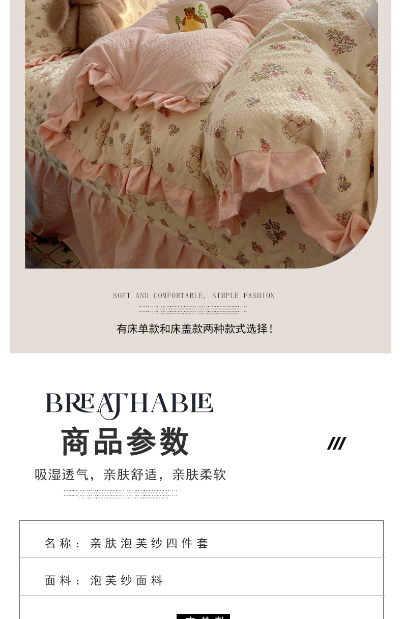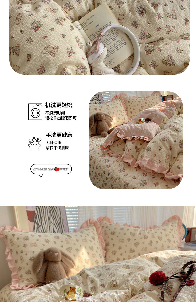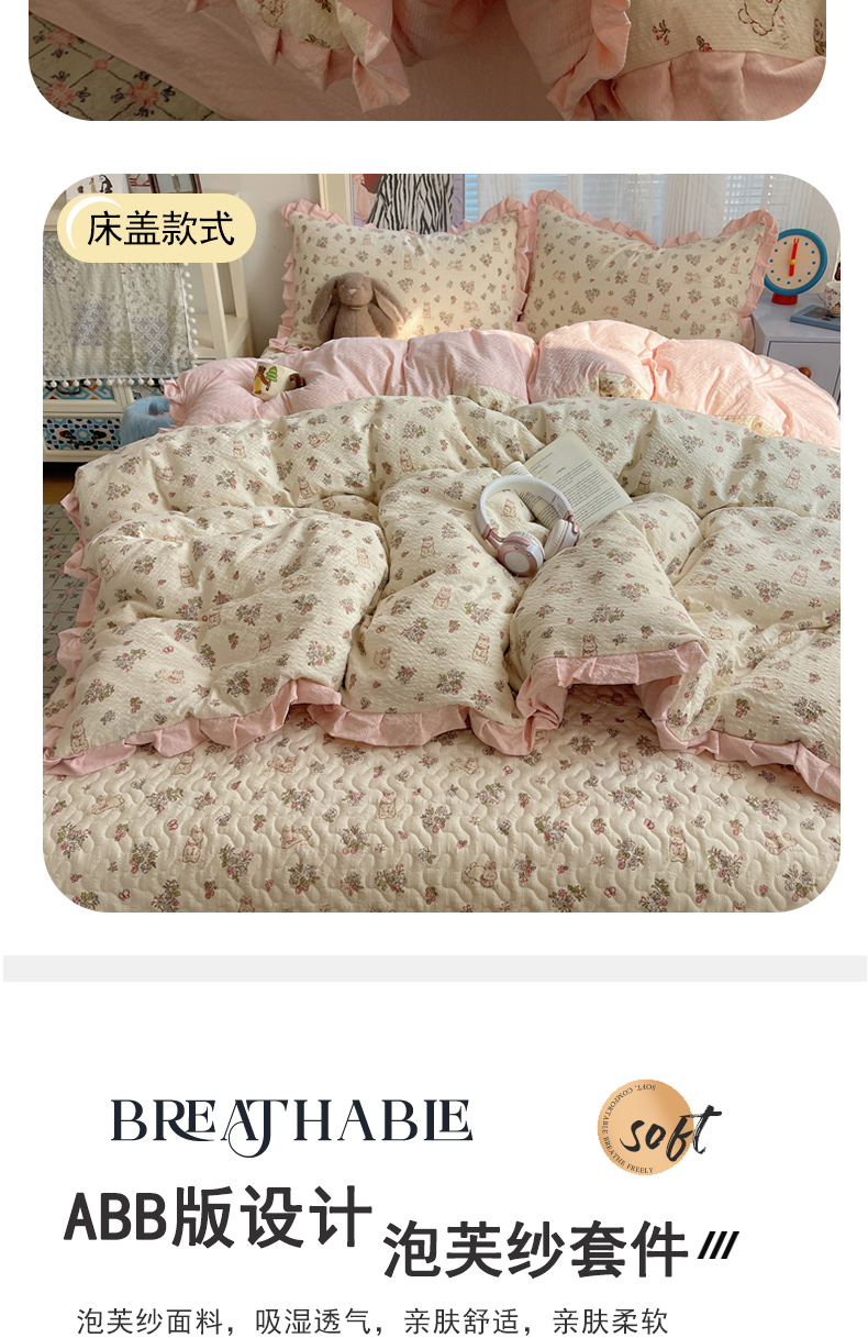 商品名称:迪梦姿家纺 2026新款高克重泡芙纱泡泡纱床单款四件套系列 花野兔眠