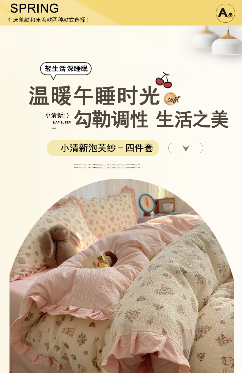 (总)迪梦姿家纺 2026新款高克重泡芙纱泡泡纱床单款四件套系列,兔仔花田,春日甜桃心米,纯宅熊,躲猫猫,花野兔眠,灰樱桃,旧街星星,猫咪集粉,莓系花伐,描线小猫咖,木马小花团,浅沙花影黄,浅沙花影蓝,田园兔,甜喵块块,甜心咖絮,甜心木马卷,小兔裙边,星野蝴蝶结,悦悦小兔,只闻花香,紫雾花蝶集