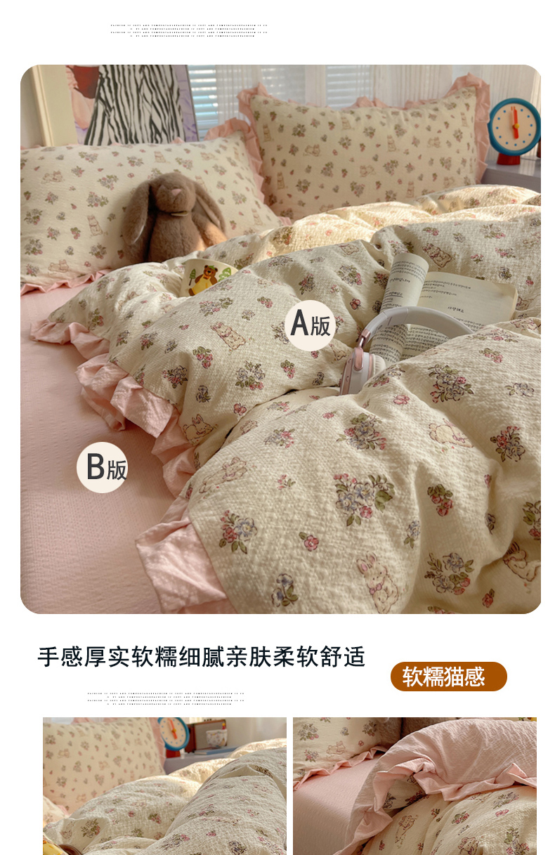 迪梦姿家纺 2026新款高克重泡芙纱泡泡纱床单款四件套系列 花野兔眠
