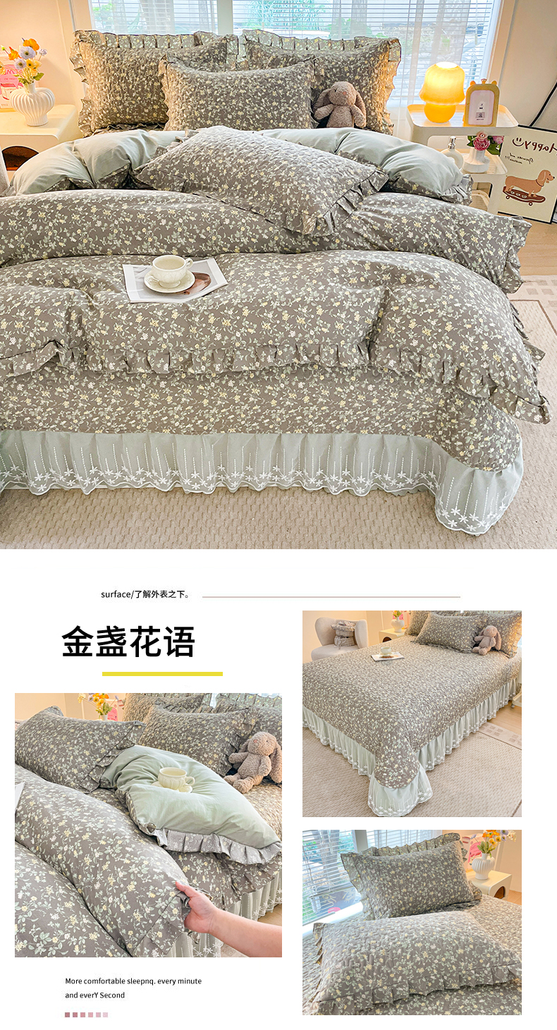 当前位置: 91家纺网 > 商品网购 > 床品套件 > 四件套 > 其它四件套 > 艺慕家纺 2026新款直播热款古法仿棉水洗棉印花双层蕾丝花边床盖四件套 金盏花语